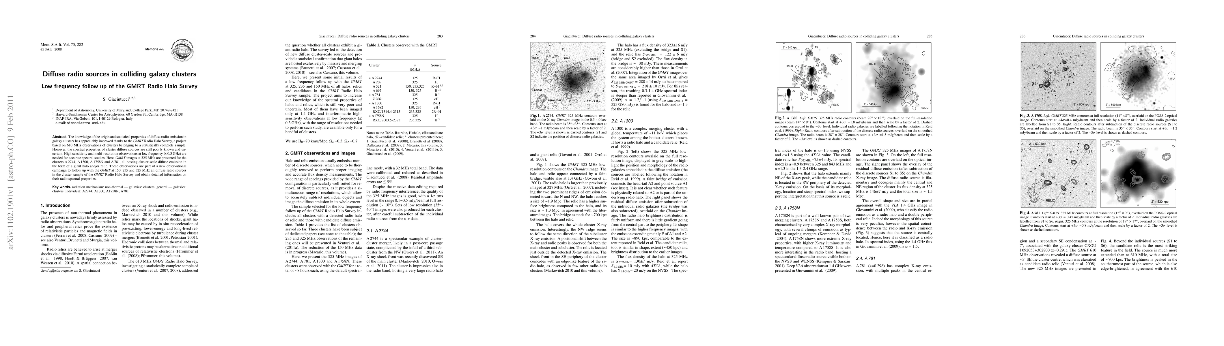 The knowledge of the origin and statistical properties of diffuse radio emission in galaxy clusters has appreciably improved thanks to the GMRT Radio Halo Survey, a project based on 610 MHz observations of clusters belonging to a statistically complete sample. However, the spectral properties of cluster diffuse sources are still poorly known and uncertain. High sensitivity and multi-resolution observations at low frequency ($\le$0.3 GHz) are needed for accurate spectral studies. Here, GMRT images at 325 MHz are presented for the clusters A2744, A1300, A1758N and A781, all hosting cluster-scale diffuse emission in the form of a giant halo and/or relic. These observations are part of a new observational campaign to follow up with the GMRT at 150, 235 and 325 MHz all diffuse radio sources in the cluster sample of the GMRT Radio Halo Survey and obtain detailed information on their radio spectral properties.