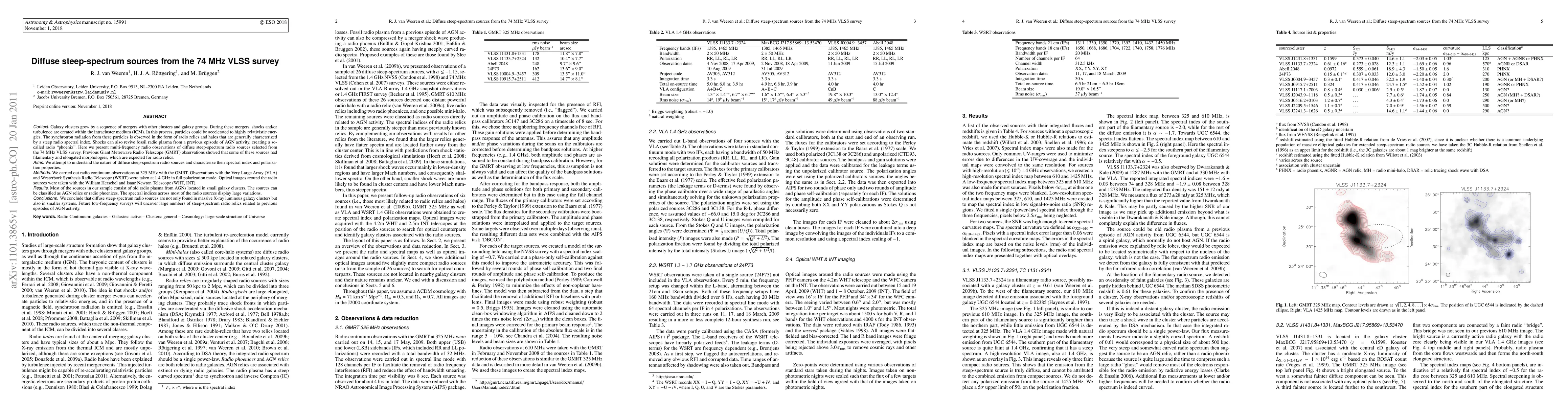This paper investigates diffuse steep-spectrum radio sources identified in the 74 MHz VLSS survey, revealing that most are old radio plasma from AGNs in small galaxy clusters. The study concludes that these sources are common in both large and smaller systems, suggesting future low-frequency surveys will discover many more related to past AGN activity.