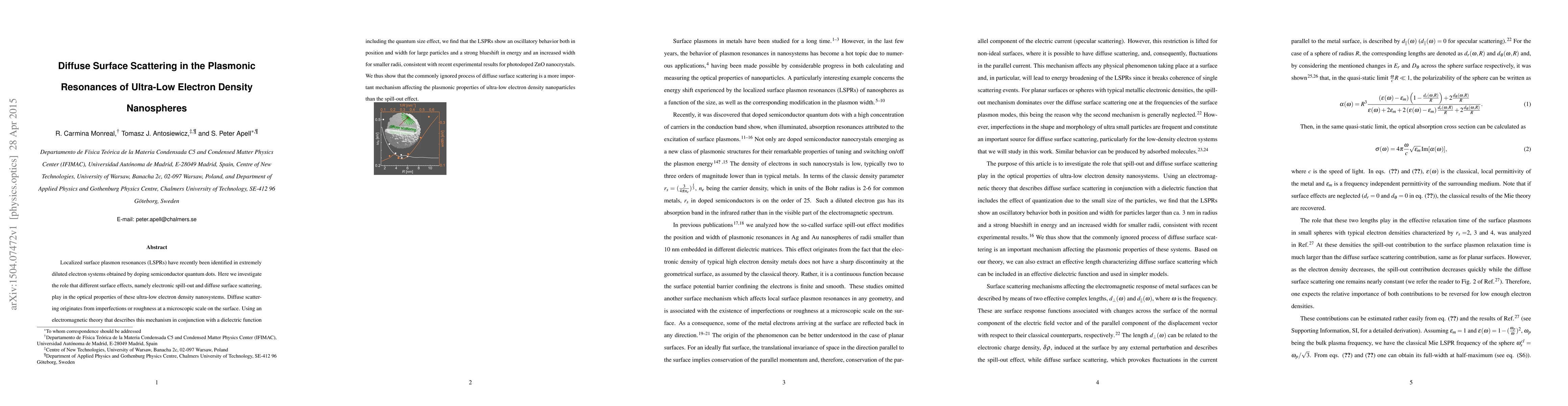 This paper investigates the impact of diffuse surface scattering on localized surface plasmon resonances (LSPRs) in ultra-low electron density nanospheres, revealing that it significantly influences LSPRs' position, width, and energy, more so than electronic spill-out, based on electromagnetic theory and experimental observations.