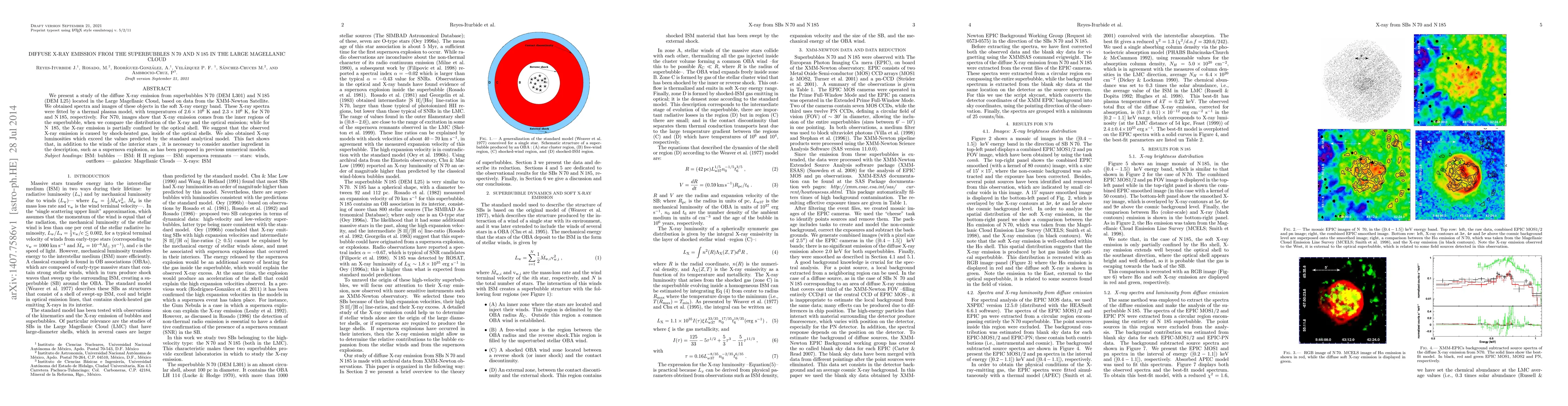 This study analyzes diffuse X-ray emissions from superbubbles N 70 and N 185 in the Large Magellanic Cloud using XMM-Newton data, revealing shock-heated gas and suggesting the need for supernova explosions in addition to stellar winds to explain the observed X-ray luminosities.
