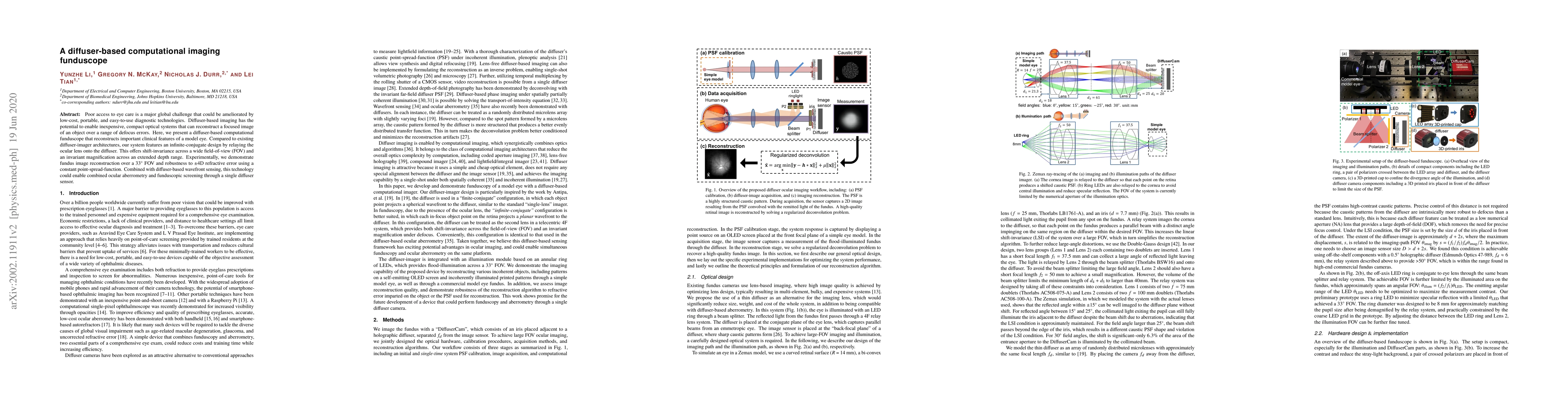 This paper presents a low-cost, portable diffuser-based computational funduscope that reconstructs clinical features of a model eye with shift-invariance and invariant magnification. The system demonstrates fundus image reconstruction over a 33° field-of-view and robustness to refractive errors, potentially enabling combined ocular aberrometry and funduscopic screening.