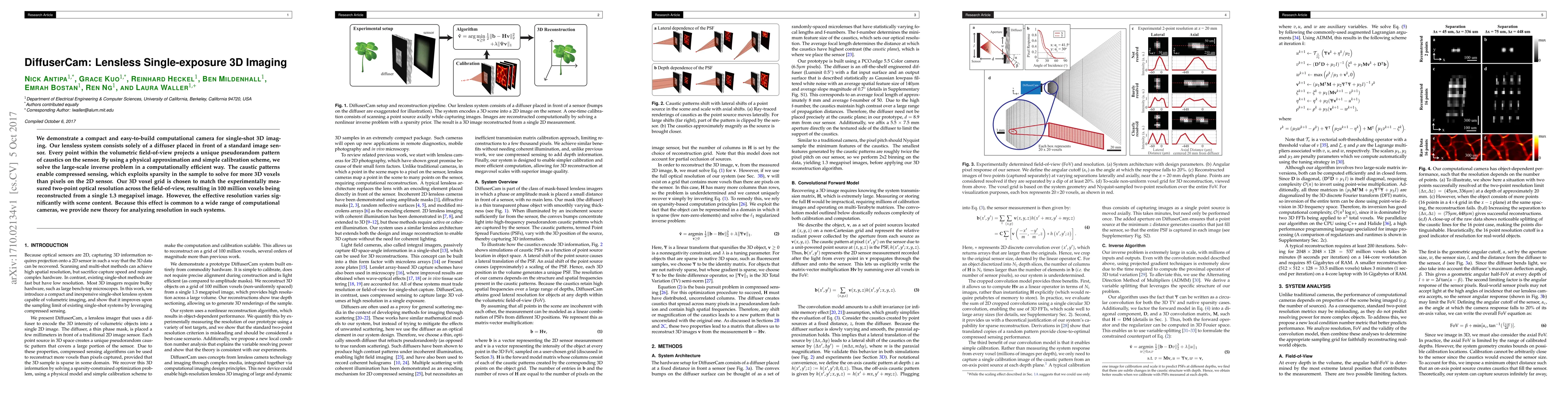 We demonstrate a compact and easy-to-build computational camera for single-shot 3D imaging. Our lensless system consists solely of a diffuser placed in front of a standard image sensor. Every point within the volumetric field-of-view projects a unique pseudorandom pattern of caustics on the sensor. By using a physical approximation and simple calibration scheme, we solve the large-scale inverse problem in a computationally efficient way. The caustic patterns enable compressed sensing, which exploits sparsity in the sample to solve for more 3D voxels than pixels on the 2D sensor. Our 3D voxel grid is chosen to match the experimentally measured two-point optical resolution across the field-of-view, resulting in 100 million voxels being reconstructed from a single 1.3 megapixel image. However, the effective resolution varies significantly with scene content. Because this effect is common to a wide range of computational cameras, we provide new theory for analyzing resolution in such systems.