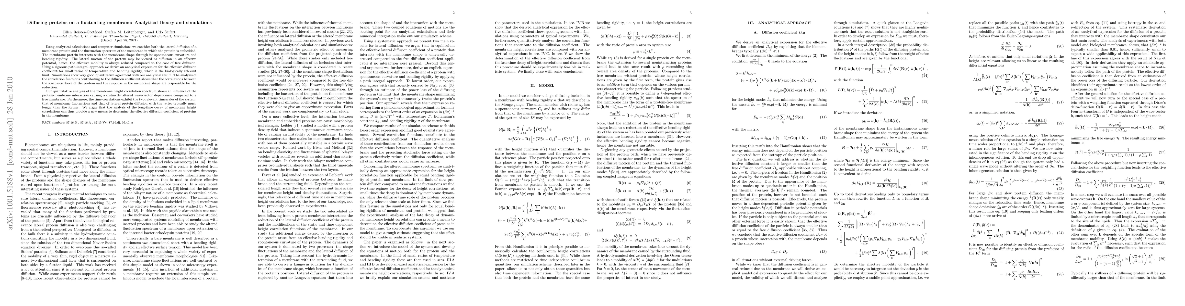 A research paper presents an analytical theory and simulations to study the diffusion of proteins on a fluctuating membrane, revealing that protein motion is reduced due to interactions with the membrane shape.