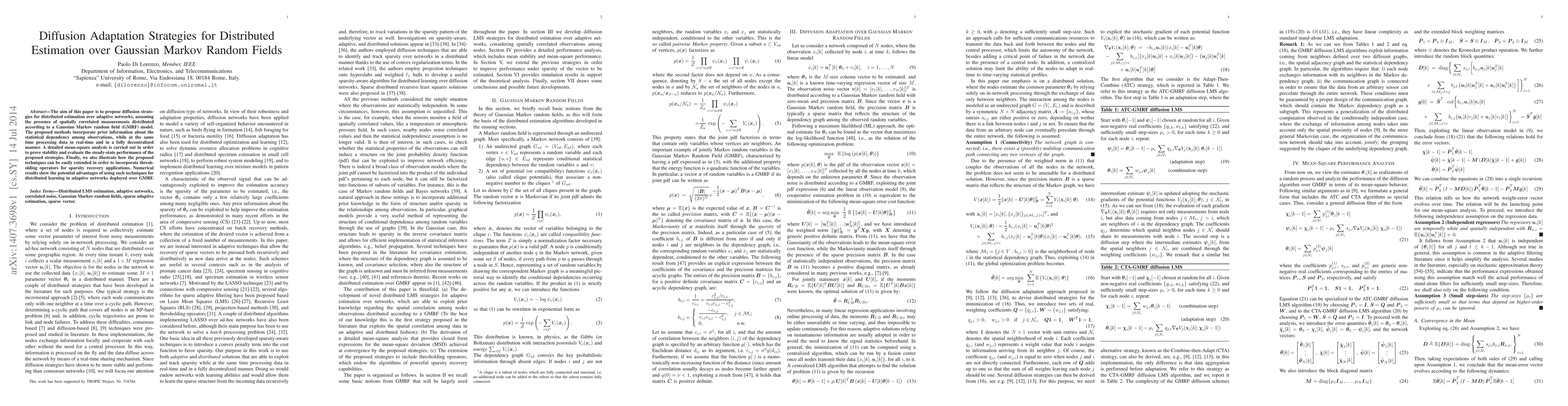 This paper proposes diffusion strategies for distributed estimation over adaptive networks using Gaussian Markov random fields (GMRF) to account for spatial correlations. The methods are decentralized, real-time, and incorporate statistical dependencies, with mean-square analysis proving stability and performance, and extensions for sparsity recovery.