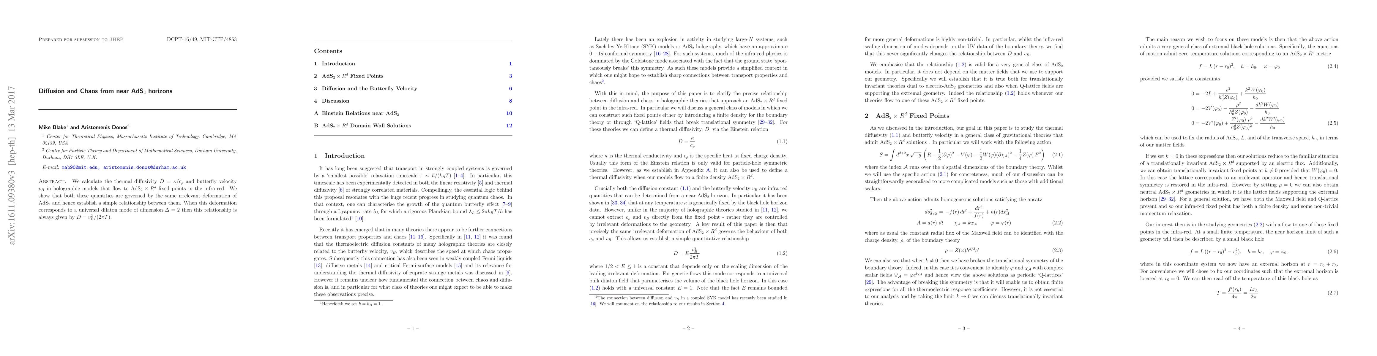 This paper calculates thermal diffusivity and butterfly velocity in holographic models near AdS$_2$ horizons, demonstrating they are both governed by a universal dilaton mode. The relationship established is $D = v_B^2/(2 \pi T)$.