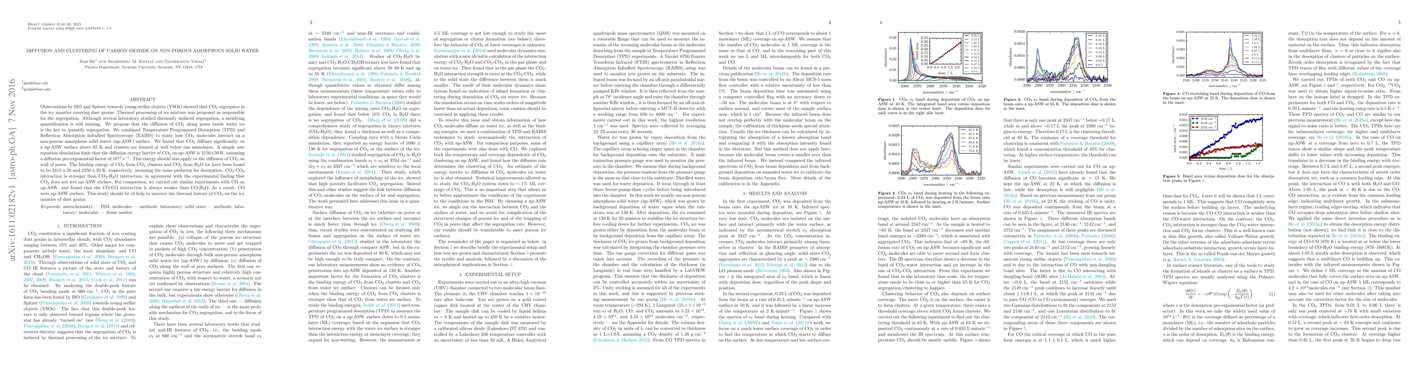Observations by ISO and Spitzer towards young stellar objects (YSOs) showed that CO$_2$ segregates in the icy mantles covering dust grains. Thermal processing of ice mixture was proposed as responsible for the segregation. Although several laboratory studied thermally induced segregation, a satisfying quantification is still missing. We propose that the diffusion of CO$_2$ along pores inside water ice is the key to quantify segregation. We combined Temperature Programmed Desorption (TPD) and Reflection Absorption InfraRed Spectroscopy (RAIRS) to study how CO$_2$ molecules interact on a non-porous amorphous solid water (np-ASW) surface. We found that CO$_2$ diffuses significantly on a np-ASW surface above 65~K and clusters are formed at well below one monolayer. A simple rate equation simulation finds that the diffusion energy barrier of CO$_2$ on np-ASW is 2150$\pm$50 K, assuming a diffusion pre-exponential factor of 10$^{12}$ s$^{-1}$. This energy should also apply to the diffusion of CO$_2$ on wall of pores. The binding energy of CO$_2$ from CO$_2$ clusters and CO$_2$ from H$_2$O ice have been found to be $2415\pm20$ and $2250\pm20$~K, respectively, assuming the same prefactor for desorption. CO$_2$-CO$_2$ interaction is stronger than CO$_2$-H$_2$O interaction, in agreement with the experimental finding that CO$_2$ does not wet np-ASW surface. For comparison, we carried out similar experiments with CO on np-ASW, and found that the CO-CO interaction is always weaker than CO-H$_2$O. As a result, CO wets np-ASW surface. This study should be of help to uncover the thermal history of CO$_2$ on the icy mantles of dust grains.