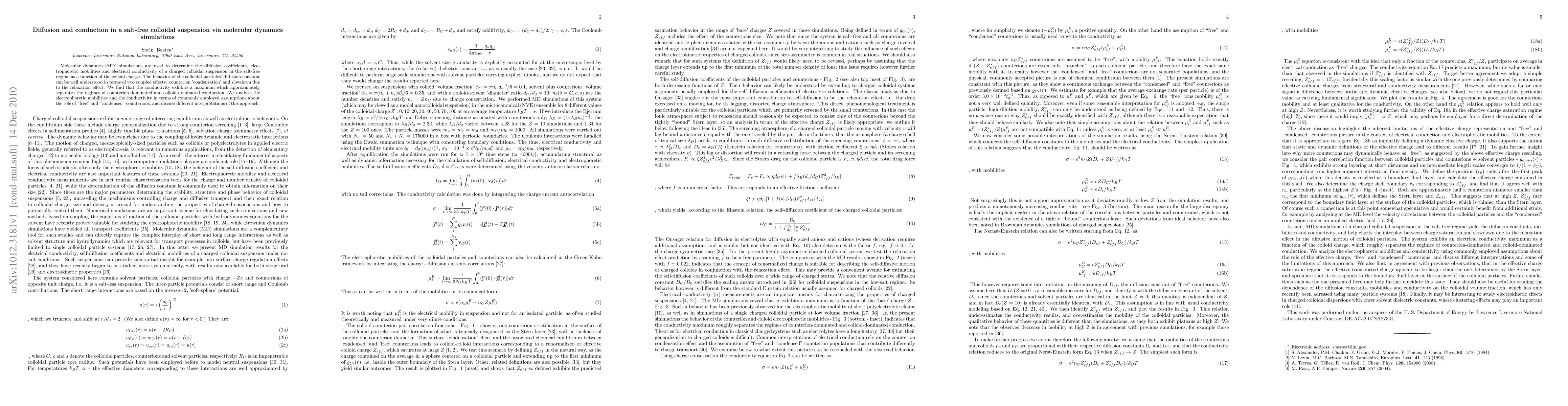 This paper uses molecular dynamics simulations to study the diffusion, electrophoretic mobility, and electrical conductivity of salt-free charged colloidal suspensions. The findings reveal that conductivity peaks, distinguishing counterion-dominated and colloid-dominated conduction regimes, and discuss the implications of counterion condensation and relaxation effects on these properties.
