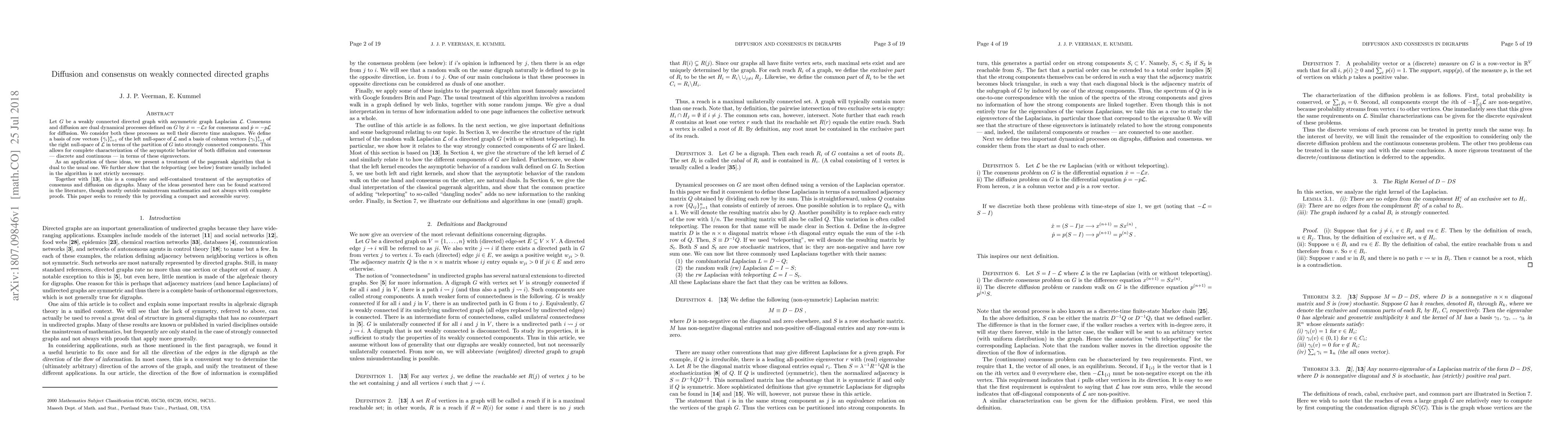 Let $G$ be a weakly connected directed graph with asymmetric graph Laplacian ${\cal L}$. Consensus and diffusion are dual dynamical processes defined on $G$ by $\dot x=-{\cal L}x$ for consensus and $\dot p=-p{\cal L}$ for diffusion. We consider both these processes as well their discrete time analogues. We define a basis of row vectors $\{\bar \gamma_i\}_{i=1}^k$ of the left null-space of ${\cal L}$ and a basis of column vectors $\{\gamma_i\}_{i=1}^k$ of the right null-space of ${\cal L}$ in terms of the partition of $G$ into strongly connected components. This allows for complete characterization of the asymptotic behavior of both diffusion and consensus --- discrete and continuous --- in terms of these eigenvectors. As an application of these ideas, we present a treatment of the pagerank algorithm that is dual to the usual one. We further show that the teleporting feature usually included in the algorithm is not strictly necessary. This is a complete and self-contained treatment of the asymptotics of consensus and diffusion on digraphs. Many of the ideas presented here can be found scattered in the literature, though mostly outside mainstream mathematics and not always with complete proofs. This paper seeks to remedy this by providing a compact and accessible survey.