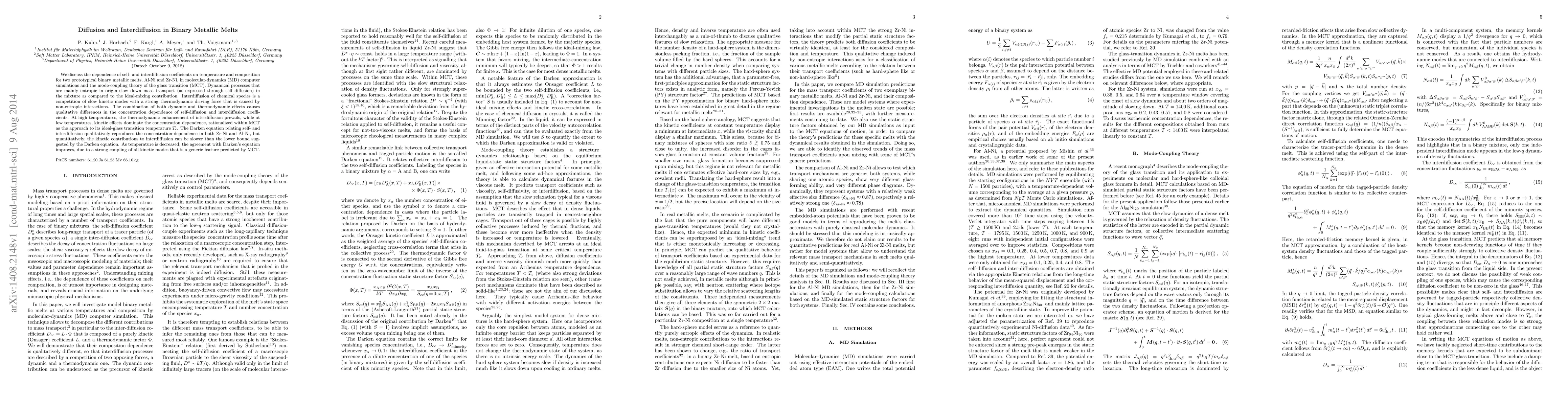 We discuss the dependence of self- and interdiffusion coefficients on temperature and composition for two prototypical binary metallic melts, Al-Ni and Zr-Ni, in molecular-dynamics (MD) computer simulations and the mode-coupling theory of the glass transition (MCT). Dynamical processes that are mainly entropic in origin slow down mass transport (as expressed through self diffusion) in the mixture as compared to the ideal-mixing contribution. Interdiffusion of chemical species is a competition of slow kinetic modes with a strong thermodynamic driving force that is caused by non-entropic interactions. The combination of both dynamic and thermodynamic effects causes qualitative differences in the concentration dependence of self-diffusion and interdiffusion coefficients. At high temperatures, the thermodynamic enhancement of interdiffusion prevails, while at low temperatures, kinetic effects dominate the concentration dependence, rationalized within MCT as the approach to its ideal-glass transition temperature $T_c$. The Darken equation relating self- and interdiffusion qualitatively reproduces the concentration-dependence in both Zr-Ni and Al-Ni, but quantitatively, the kinetic contributions to interdiffusion can be slower than the lower bound suggested by the Darken equation. As temperature is decreased, the agreement with Darken's equation improves, due to a strong coupling of all kinetic modes that is a generic feature predicted by MCT.