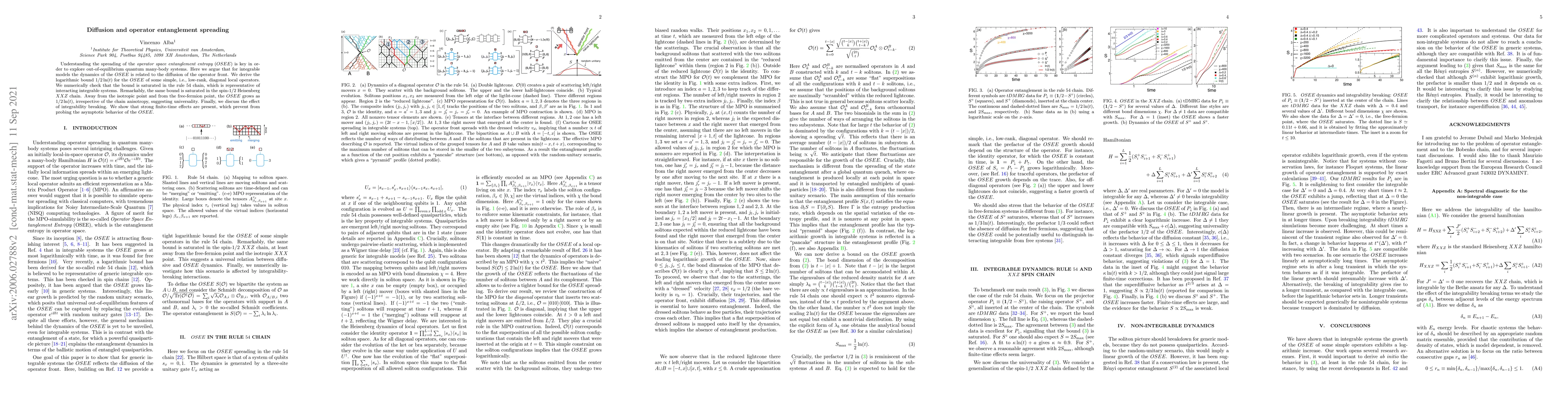 This paper explores the relationship between the spreading of operator space entanglement entropy ($OSEE$) and quasiparticle diffusion in integrable quantum many-body systems, deriving a logarithmic growth bound $1/2\ln(t)$ for low-rank diagonal operators. Numerical checks confirm this bound in the rule $54$ chain and the spin-1/2 Heisenberg $XXZ$ chain, indicating a universal behavior.