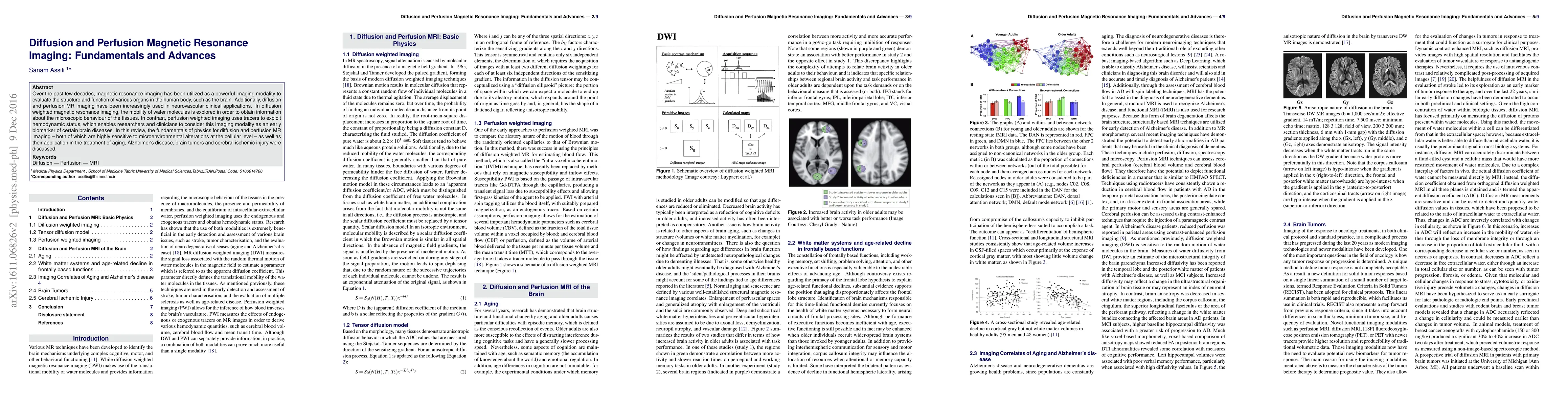 Over the past few decades, magnetic resonance imaging has been utilized as a powerful imaging modality to evaluate the structure and function of various organs in the human body,such as the brain. Additionally, diffusion and perfusion MR imaging have been increasingly used in neurovascular clinical applications. In diffusion-weighted magnetic resonance imaging, the mobility of water molecules is explored in order to obtain information about the microscopic behavior of the tissues. In contrast, perfusion weighted imaging uses tracers to exploit hemodynamic status, which enables researchers and clinicians to consider this imaging modality as an early biomarker of certain brain diseases. In this review, the fundamentals of physics for diffusion and perfusion MR imaging both of which are highly sensitive to microenvironmental alterations at the cellular level as well as their application in the treatment of aging, Alzheimer's disease, brain tumors and cerebral ischemic injury were discussed.