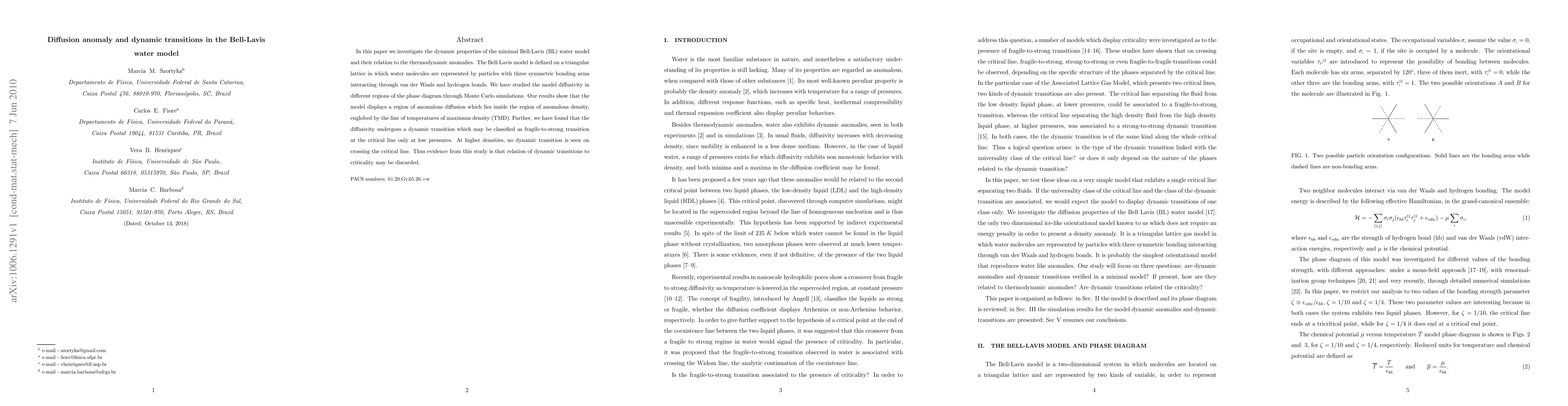This paper investigates the Bell-Lavis water model's dynamic properties and their relation to thermodynamic anomalies, revealing anomalous diffusion within the region of anomalous density. It finds a fragile-to-strong dynamic transition at low pressures but not at higher densities, suggesting no direct link between dynamic transitions and criticality.