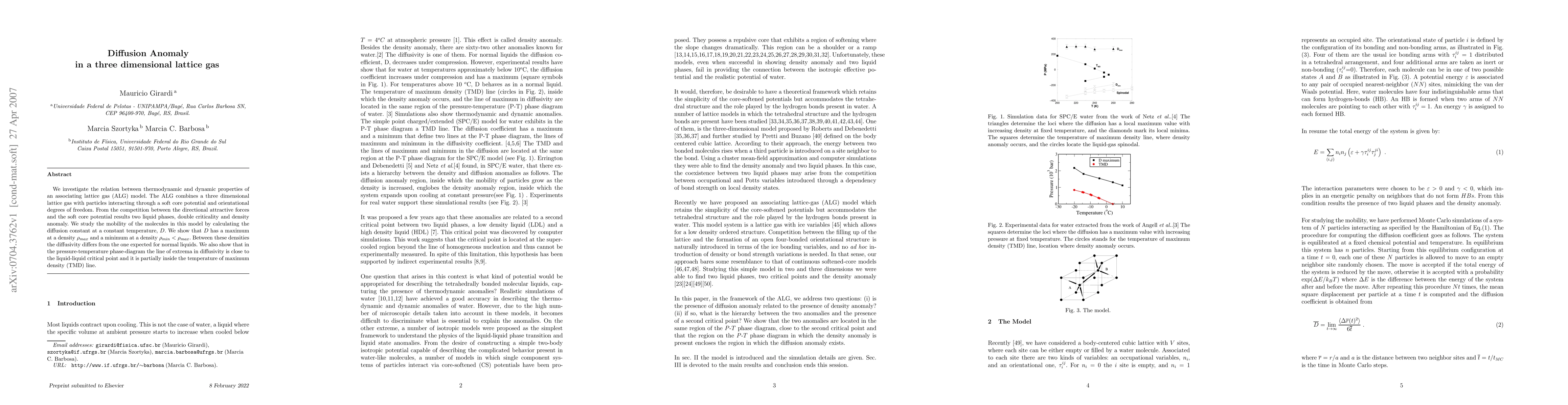This paper explores the thermodynamic and dynamic properties of an associating lattice gas model featuring three-dimensional particles with orientational interactions. It reveals a diffusion anomaly where the diffusion constant exhibits a maximum and minimum, indicating unusual mobility between these densities, closely related to the liquid-liquid critical point.