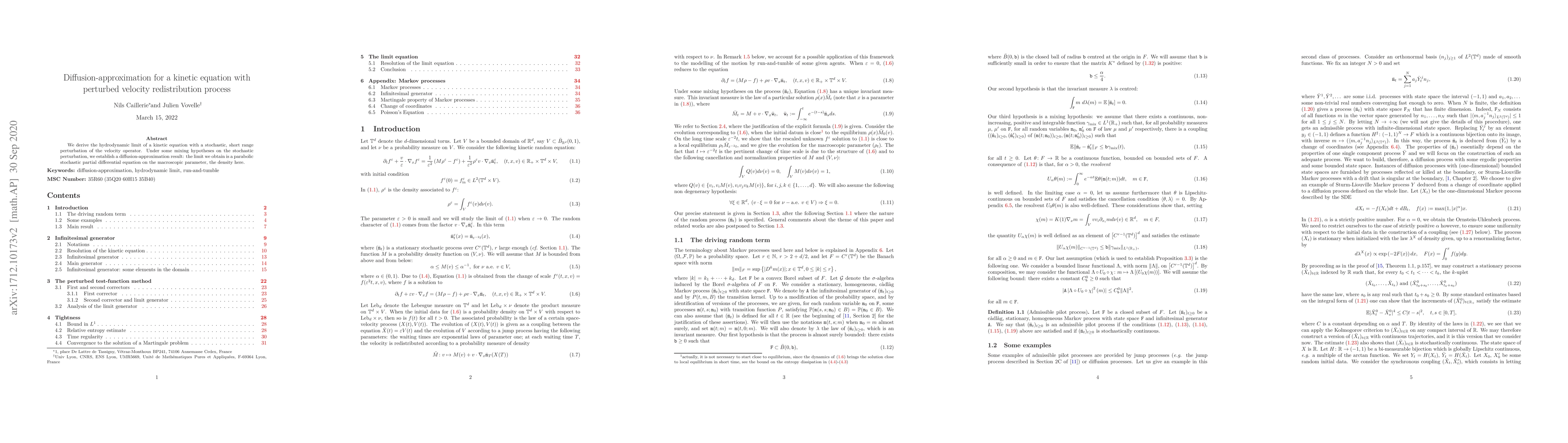 Summary: This paper derives the hydrodynamic limit for a kinetic equation with a stochastic perturbation in the velocity redistribution process, establishing a diffusion-approximation result that leads to a parabolic stochastic partial differential equation governing the macroscopic density.