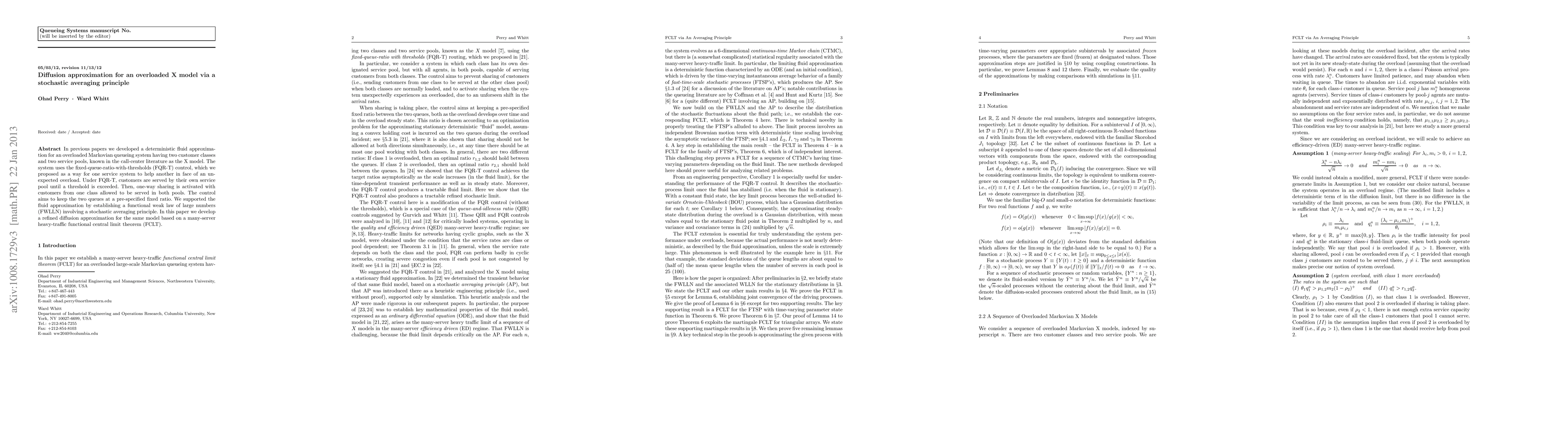 This paper refines a deterministic fluid approximation for an overloaded Markovian queueing system (X model) with two customer classes and service pools, using a stochastic averaging principle. It builds on a previous many-server heavy-traffic functional weak law of large numbers, now developing a diffusion approximation based on a functional central limit theorem.