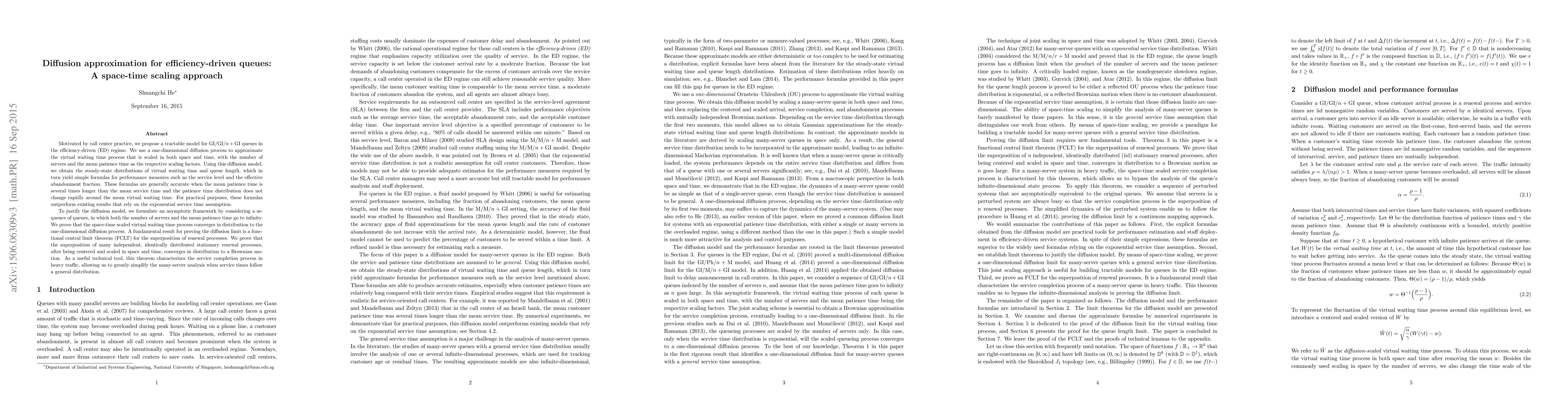Motivated by call center practice, we propose a tractable model for $\mbox{GI}/\mbox{GI}/n+\mbox{GI}$ queues in the efficiency-driven (ED) regime. We use a one-dimensional diffusion process to approximate the virtual waiting time process that is scaled in both space and time, with the number of servers and the mean patience time as the respective scaling factors. Using this diffusion model, we obtain the steady-state distributions of virtual waiting time and queue length, which in turn yield simple formulas for performance measures such as the service level and the effective abandonment fraction. These formulas are generally accurate when the mean patience time is several times longer than the mean service time and the patience time distribution does not change rapidly around the mean virtual waiting time. For practical purposes, these formulas outperform existing results that rely on the exponential service time assumption. To justify the diffusion model, we formulate an asymptotic framework by considering a sequence of queues, in which both the number of servers and the mean patience time go to infinity. We prove that the space-time scaled virtual waiting time process converges in distribution to the one-dimensional diffusion process. A fundamental result for proving the diffusion limit is a functional central limit theorem (FCLT) for the superposition of renewal processes. We prove that the superposition of many independent, identically distributed stationary renewal processes, after being centered and scaled in space and time, converges in distribution to a Brownian motion. As a useful technical tool, this theorem characterizes the service completion process in heavy traffic, allowing us to greatly simplify the many-server analysis when service times follow a general distribution.
