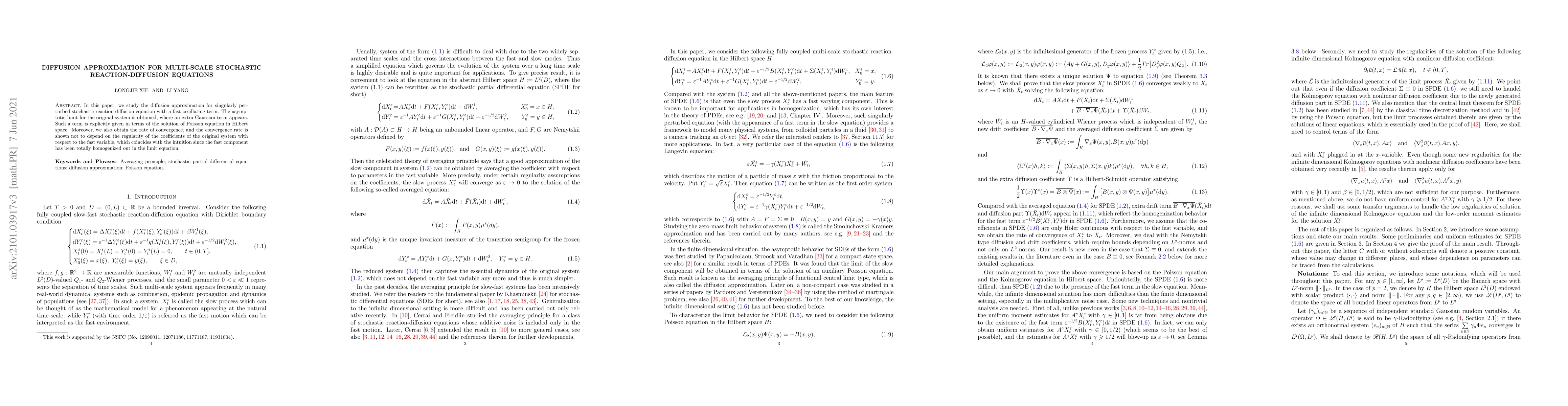 This paper investigates the diffusion approximation for singularly perturbed stochastic reaction-diffusion equations with fast oscillating terms, deriving an asymptotic limit that includes an extra Gaussian term. The optimal rate of convergence is obtained, demonstrating that the convergence rate is independent of the regularity of the coefficients, reflecting the homogenization of the fast component.