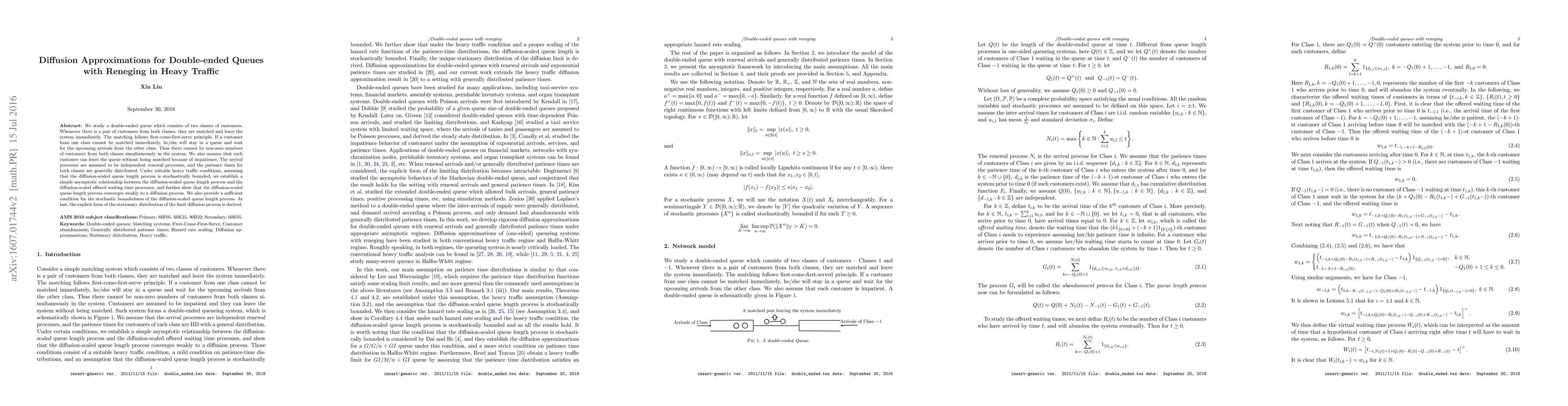 We study a double-ended queue which consists of two classes of customers. Whenever there is a pair of customers from both classes, they are matched and leave the system immediately. The matching follows first-come-first-serve principle. If a customer from one class cannot be matched immediately, he/she will stay in a queue and wait for the upcoming arrivals from the other class. Thus there cannot be non-zero numbers of customers from both classes simultaneously in the system. We also assume that each customer can leave the queue without being matched because of impatience. The arrival processes are assumed to be independent renewal processes, and the patience times for both classes are generally distributed. Under suitable heavy traffic conditions, assuming that the diffusion-scaled queue length process is stochastically bounded, we establish a simple asymptotic relationship between the diffusion-scaled queue length process and the diffusion-scaled offered waiting time process, and further show that the diffusion-scaled queue length process converges weakly to a diffusion process. We also provide a sufficient condition for the stochastic boundedness of the diffusion-scaled queue length process. At last, the explicit form of the stationary distribution of the limit diffusion process is derived.