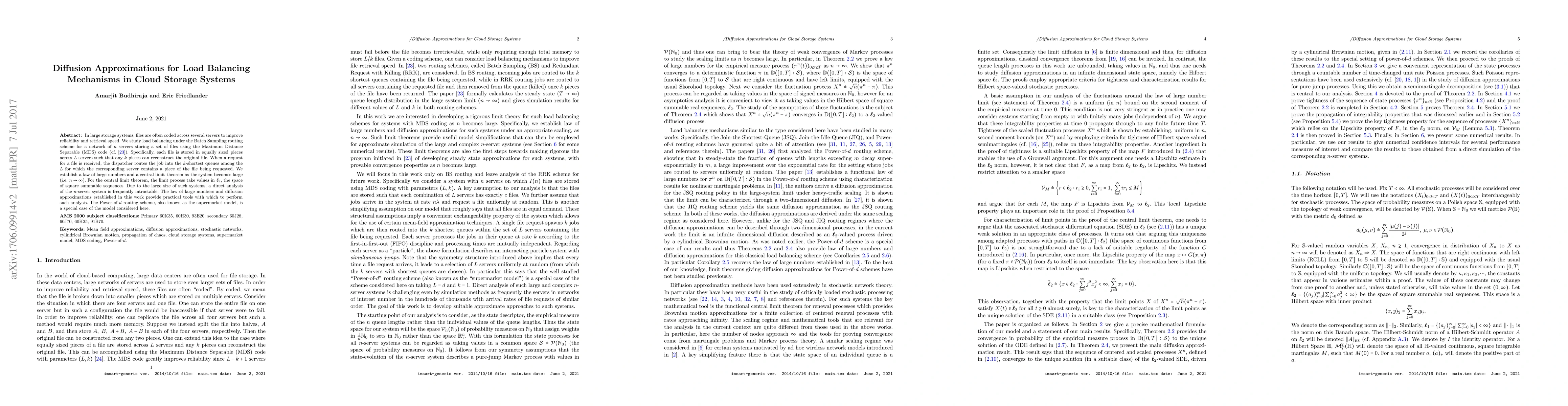This paper develops a diffusion approximation for load balancing in cloud storage systems, allowing large-scale analysis through laws of large numbers and central limit theorems.