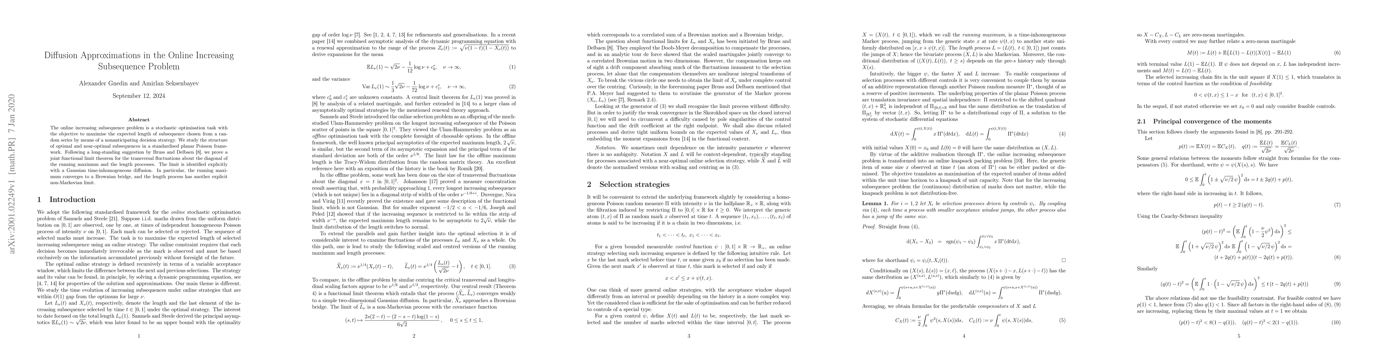 The online increasing subsequence problem is a stochastic optimisation task with the objective to maximise the expected length of subsequence chosen from a random series by means of a nonanticipating decision strategy. We study the structure of optimal and near-optimal subsequences in a standardised planar Poisson framework. Following a long-standing suggestion by Bruss and Delbaen (Stoch. Proc. Appl. 114, 2004), we prove a joint functional limit theorem for the transversal fluctuations about the diagonal of the running maximum and the length processes. The limit is identified explicitly with a Gaussian time-inhomogeneous diffusion. In particular, the running maximum converges to a Brownian bridge, and the length process has another explicit non-Markovian limit.