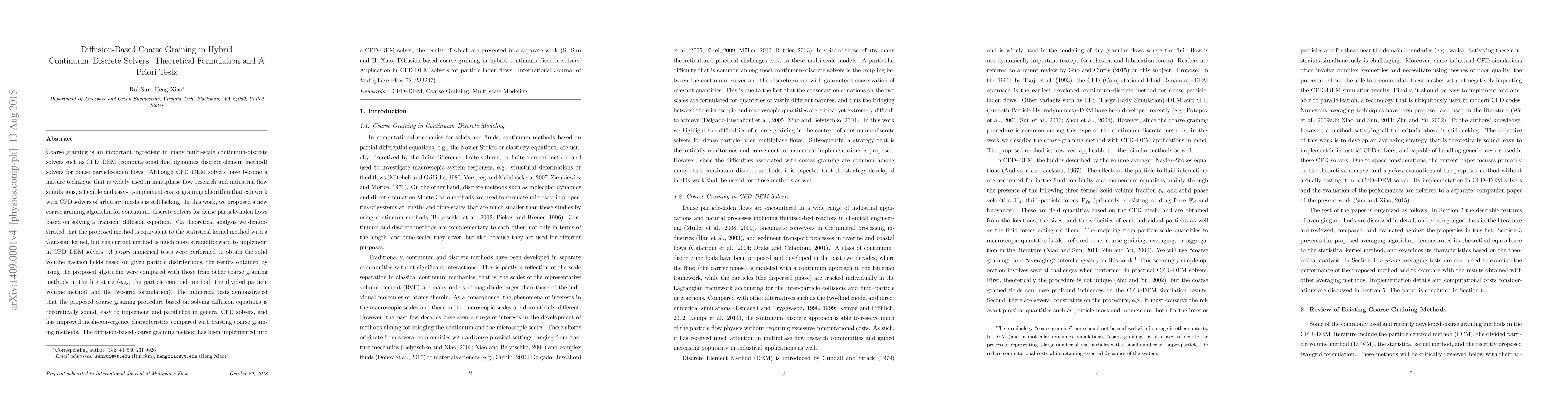 This paper proposes a novel diffusion-based coarse graining algorithm for continuum-discrete solvers used in dense particle-laden flows, demonstrating its equivalence to the statistical kernel method with a Gaussian kernel but with simpler implementation. A priori tests show the method's improved mesh-convergence and ease of parallelization compared to existing coarse graining methods.