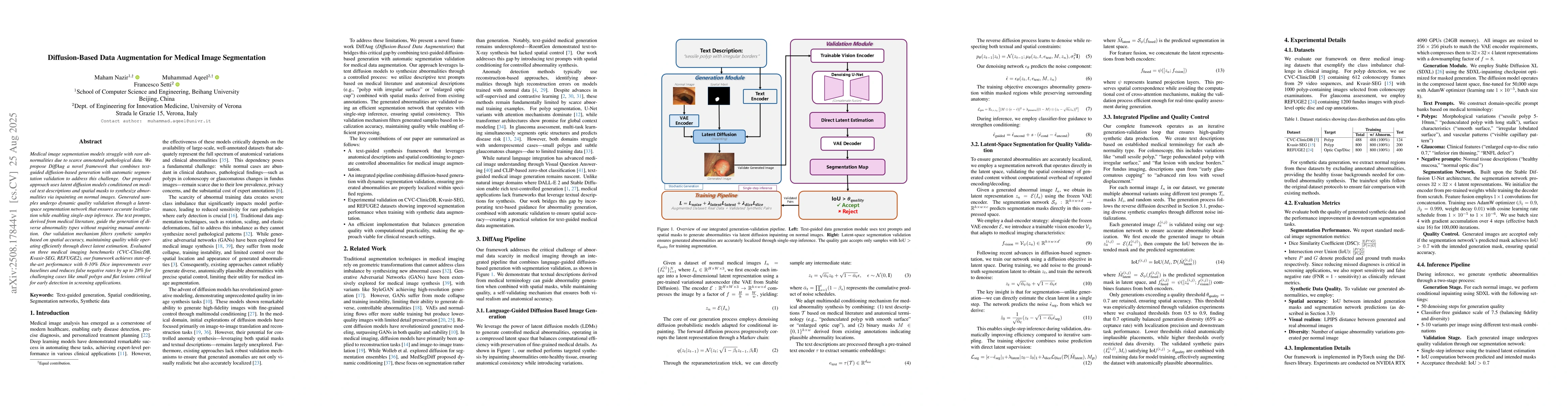 Medical image segmentation models struggle with rare abnormalities due to scarce annotated pathological data. We propose DiffAug a novel framework that combines textguided diffusion-based generation with automatic segmentation validation to address this challenge. Our proposed approach uses latent diffusion models conditioned on medical text descriptions and spatial masks to synthesize abnormalities via inpainting on normal images. Generated samples undergo dynamic quality validation through a latentspace segmentation network that ensures accurate localization while enabling single-step inference. The text prompts, derived from medical literature, guide the generation of diverse abnormality types without requiring manual annotation. Our validation mechanism filters synthetic samples based on spatial accuracy, maintaining quality while operating efficiently through direct latent estimation. Evaluated on three medical imaging benchmarks (CVC-ClinicDB, Kvasir-SEG, REFUGE2), our framework achieves state-of-the-art performance with 8-10% Dice improvements over baselines and reduces false negative rates by up to 28% for challenging cases like small polyps and flat lesions critical for early detection in screening applications.