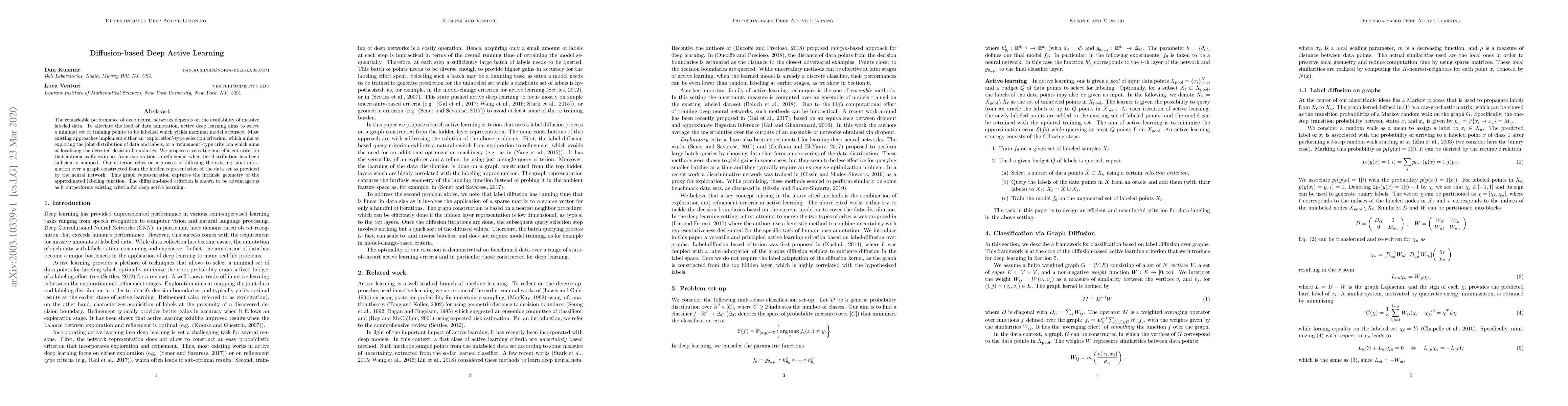 This paper proposes a diffusion-based deep active learning method that dynamically switches between exploration and refinement to select the most informative training points. It leverages the intrinsic geometry of the data's hidden representation to efficiently guide the labeling process, outperforming existing active learning criteria.