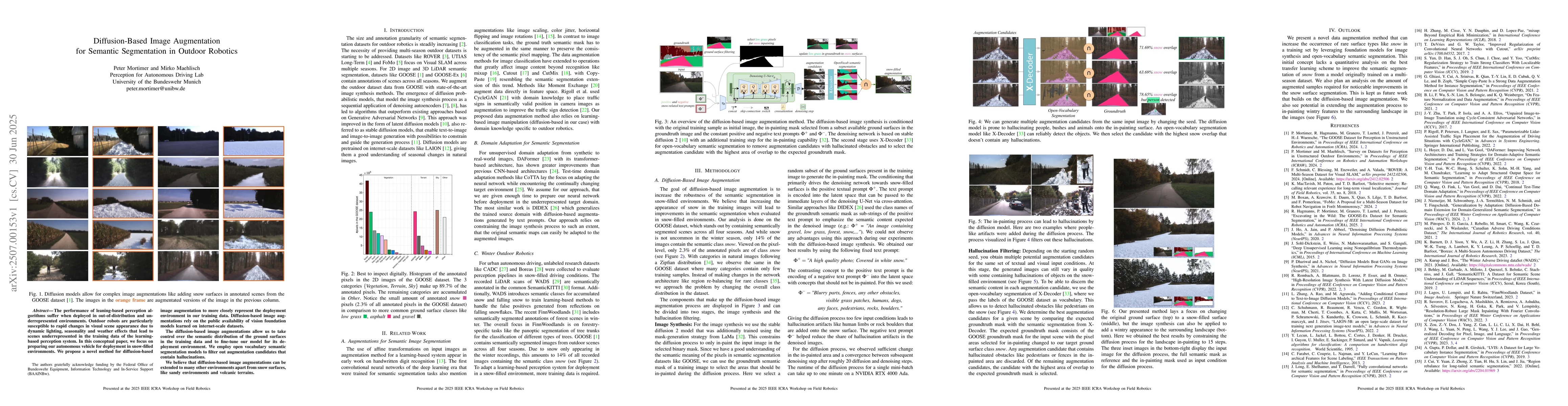 The performance of leaning-based perception algorithms suffer when deployed in out-of-distribution and underrepresented environments. Outdoor robots are particularly susceptible to rapid changes in visual scene appearance due to dynamic lighting, seasonality and weather effects that lead to scenes underrepresented in the training data of the learning-based perception system. In this conceptual paper, we focus on preparing our autonomous vehicle for deployment in snow-filled environments. We propose a novel method for diffusion-based image augmentation to more closely represent the deployment environment in our training data. Diffusion-based image augmentations rely on the public availability of vision foundation models learned on internet-scale datasets. The diffusion-based image augmentations allow us to take control over the semantic distribution of the ground surfaces in the training data and to fine-tune our model for its deployment environment. We employ open vocabulary semantic segmentation models to filter out augmentation candidates that contain hallucinations. We believe that diffusion-based image augmentations can be extended to many other environments apart from snow surfaces, like sandy environments and volcanic terrains.
