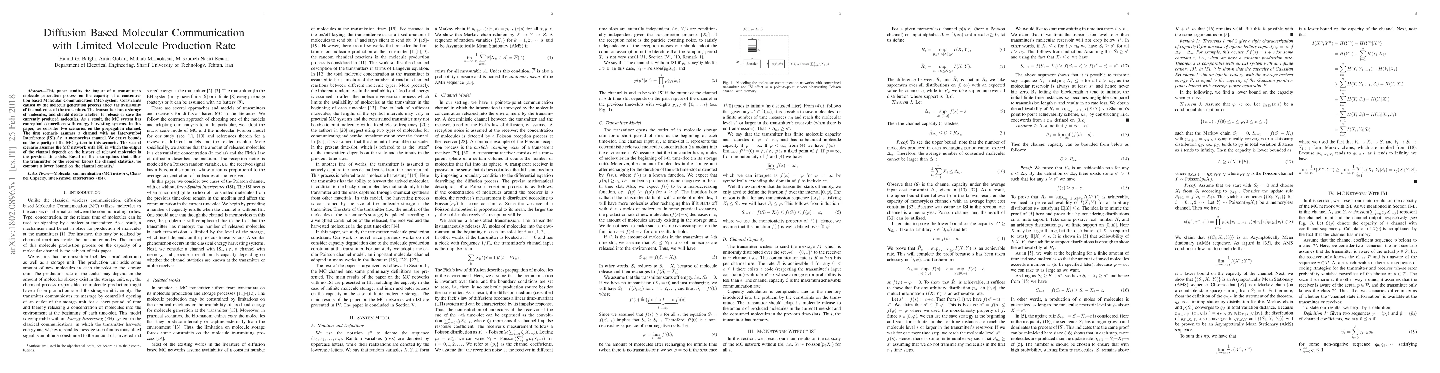 This paper explores how limited molecule production affects molecular communication systems, deriving bounds on capacity for both memoryless and ISI channels.
