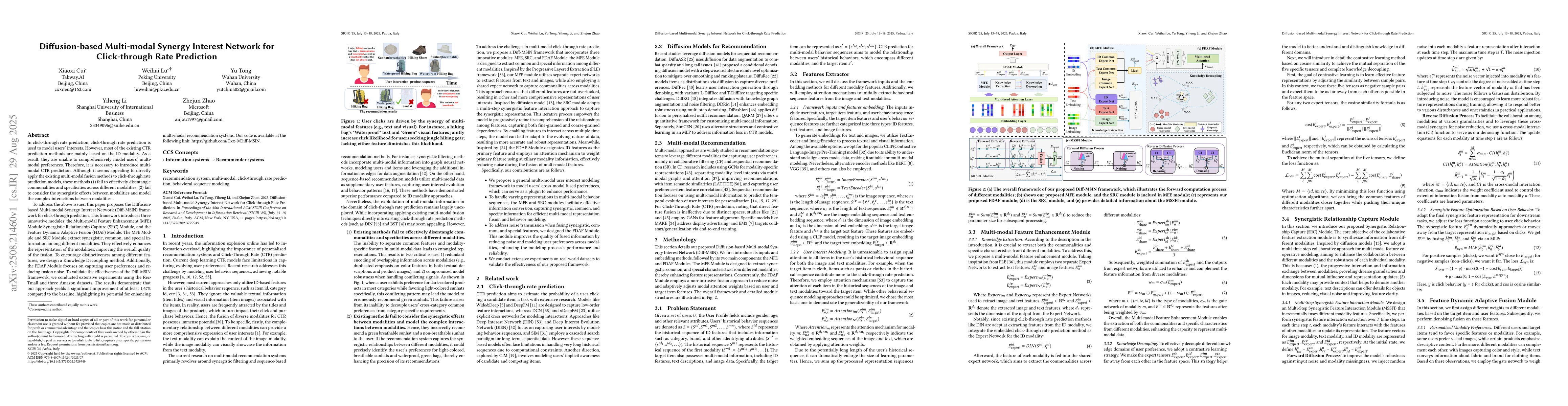 In click-through rate prediction, click-through rate prediction is used to model users' interests. However, most of the existing CTR prediction methods are mainly based on the ID modality. As a result, they are unable to comprehensively model users' multi-modal preferences. Therefore, it is necessary to introduce multi-modal CTR prediction. Although it seems appealing to directly apply the existing multi-modal fusion methods to click-through rate prediction models, these methods (1) fail to effectively disentangle commonalities and specificities across different modalities; (2) fail to consider the synergistic effects between modalities and model the complex interactions between modalities. To address the above issues, this paper proposes the Diffusion-based Multi-modal Synergy Interest Network (Diff-MSIN) framework for click-through prediction. This framework introduces three innovative modules: the Multi-modal Feature Enhancement (MFE) Module Synergistic Relationship Capture (SRC) Module, and the Feature Dynamic Adaptive Fusion (FDAF) Module. The MFE Module and SRC Module extract synergistic, common, and special information among different modalities. They effectively enhances the representation of the modalities, improving the overall quality of the fusion. To encourage distinctiveness among different features, we design a Knowledge Decoupling method. Additionally, the FDAF Module focuses on capturing user preferences and reducing fusion noise. To validate the effectiveness of the Diff-MSIN framework, we conducted extensive experiments using the Rec-Tmall and three Amazon datasets. The results demonstrate that our approach yields a significant improvement of at least 1.67% compared to the baseline, highlighting its potential for enhancing multi-modal recommendation systems. Our code is available at the following link: https://github.com/Cxx-0/Diff-MSIN.