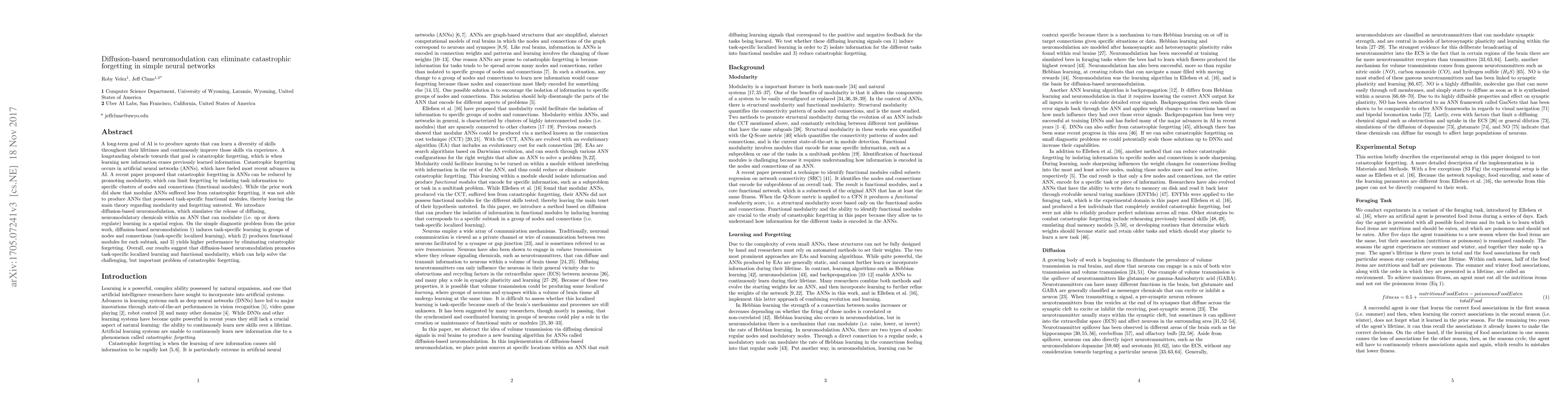 Diffusion-based neuromodulation promotes task-specific localized learning and functional modularity in neural networks, effectively eliminating catastrophic forgetting and improving performance on diagnostic tasks. This approach simulates the release of neuromodulatory chemicals to regulate learning in specific regions, thereby creating task-specific functional modules.