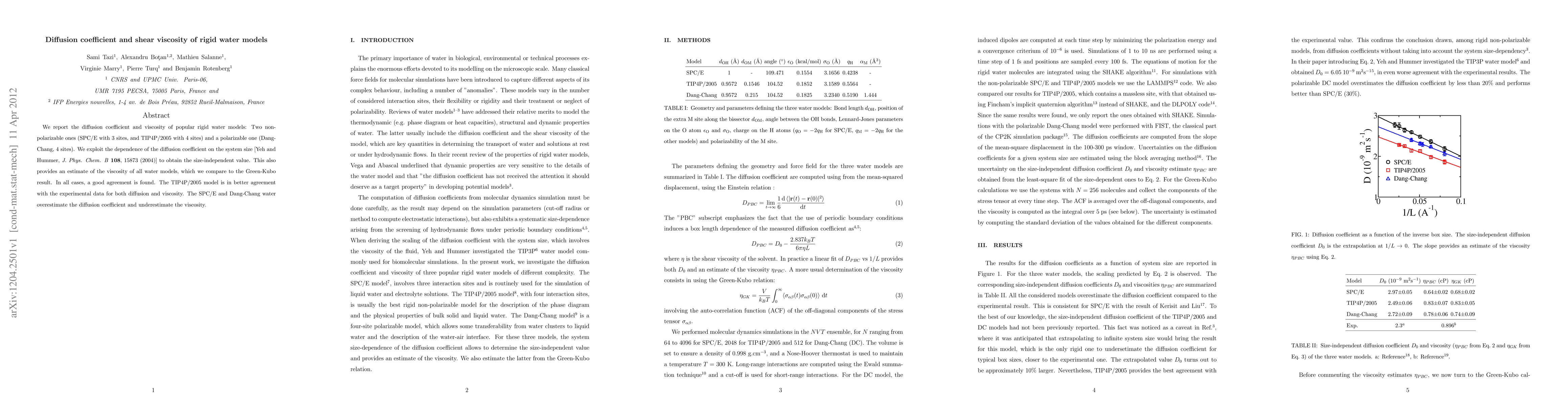This study compares the diffusion coefficient and shear viscosity of three rigid water models, finding that the TIP4P/2005 model best matches experimental data, while SPC/E and Dang-Chang models show discrepancies in diffusion and viscosity estimates.