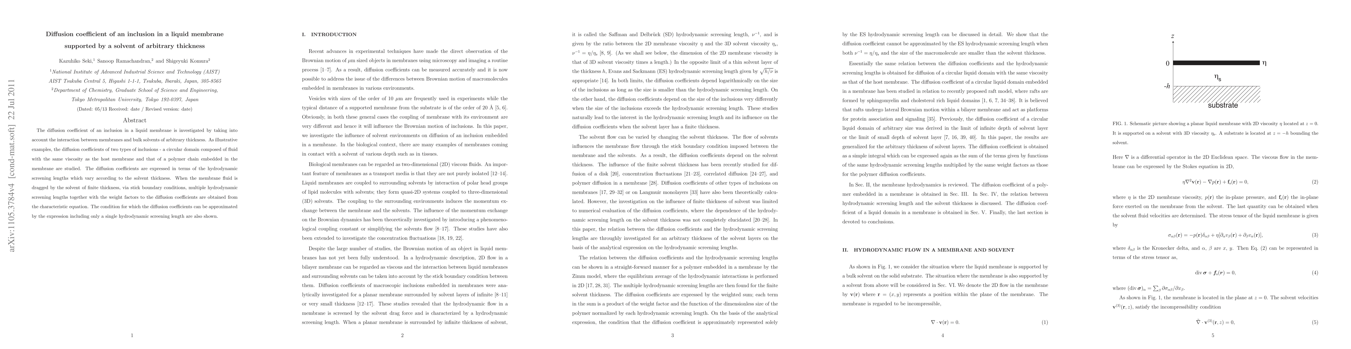 This study investigates the diffusion coefficients of circular inclusions in liquid membranes, considering interactions with varying solvent thicknesses. The diffusion coefficients for fluid domains and polymer chains are derived using hydrodynamic screening lengths that depend on solvent thickness, revealing conditions under which a single screening length suffices.