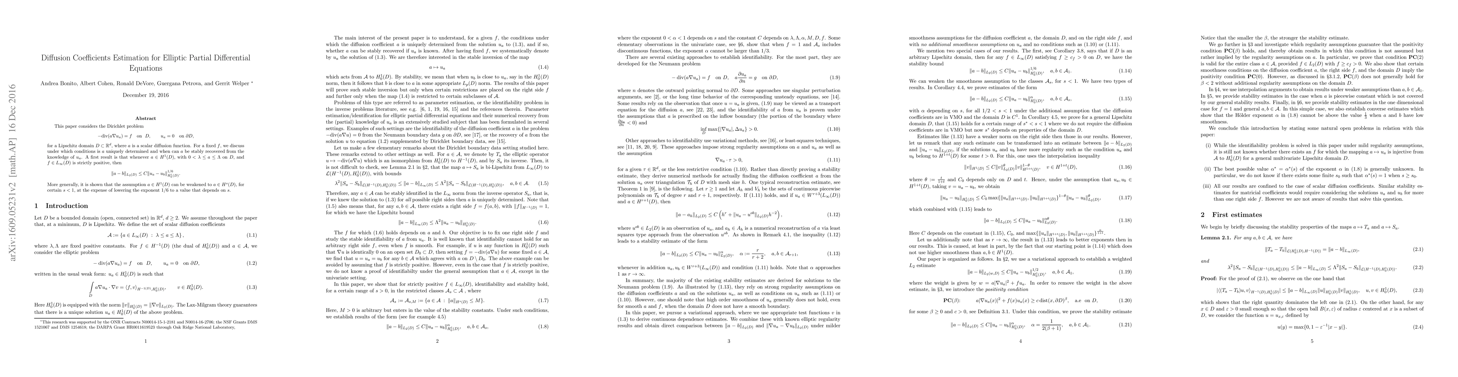 This paper considers the Dirichlet problem $$ -\mathrm{div}(a\nabla u_a)=f \quad \hbox{on}\,\,\ D, \qquad u_a=0\quad \hbox{on}\,\,\partial D, $$ for a Lipschitz domain $D\subset \mathbb R^d$, where $a$ is a scalar diffusion function. For a fixed $f$, we discuss under which conditions is $a$ uniquely determined and when can $a$ be stably recovered from the knowledge of $u_a$. A first result is that whenever $a\in H^1(D)$, with $0<\lambda \le a\le \Lambda$ on $D$, and $f\in L_\infty(D)$ is strictly positive, then $$ \|a-b\|_{L_2(D)}\le C\|u_a-u_b\|_{H_0^1(D)}^{1/6}. $$ More generally, it is shown that the assumption $a\in H^1(D)$ can be weakened to $a\in H^s(D)$, for certain $s<1$, at the expense of lowering the exponent $1/6$ to a value that depends on $s$.