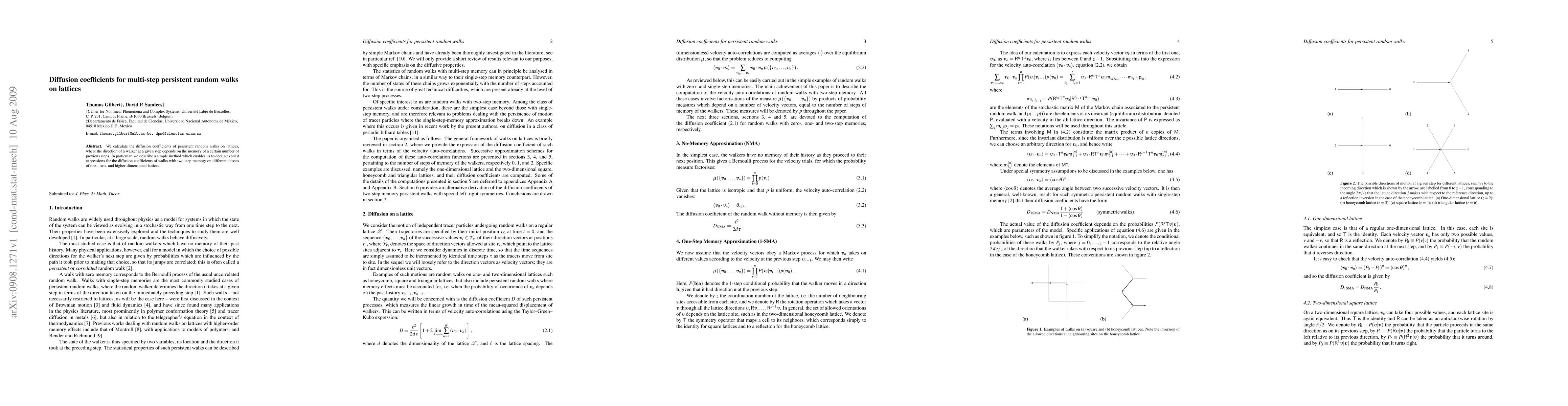 This paper calculates the diffusion coefficients for persistent random walks on various lattices, where the walker's direction depends on the memory of its previous steps. It introduces a method to derive explicit expressions for two-step memory walks across different dimensional lattices.