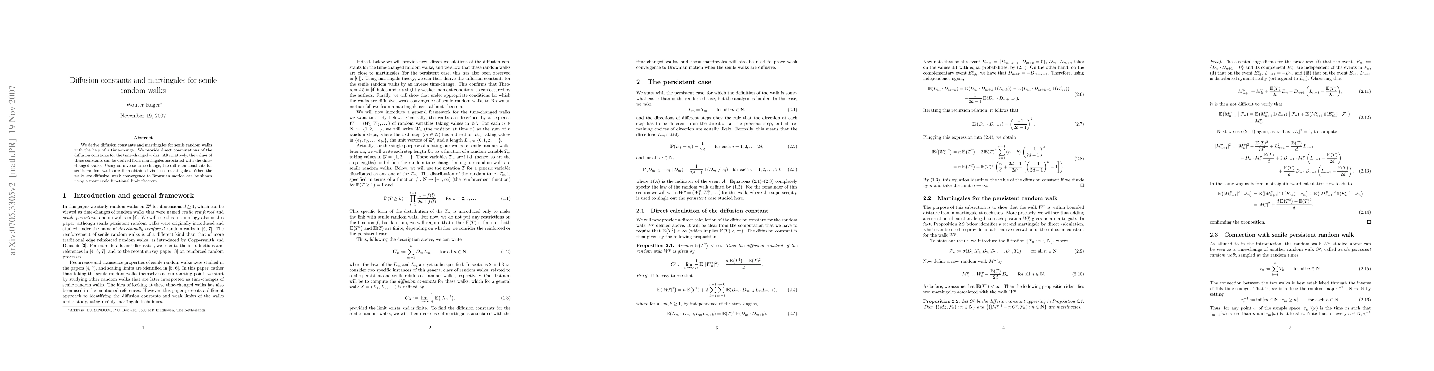 This paper derives diffusion constants and martingales for senile random walks through a time-change, providing direct computations and alternative derivations via associated martingales. It also demonstrates weak convergence to Brownian motion for diffusive walks using a martingale functional limit theorem.