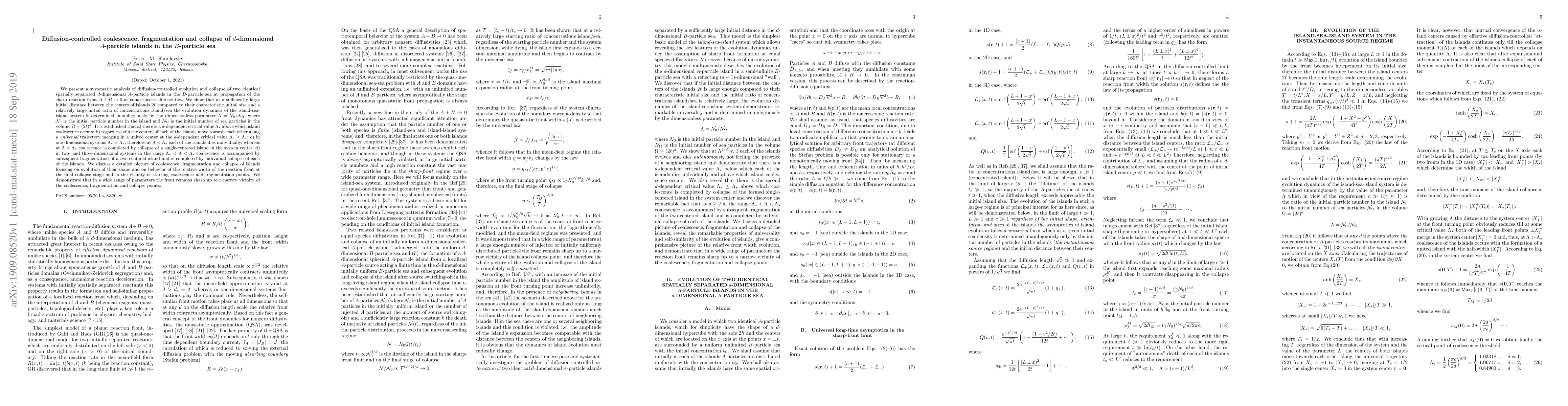 This paper systematically analyzes the diffusion-controlled evolution and collapse of two $d$-dimensional $A$-particle islands in a $B$-particle sea, revealing a $d$-dependent critical value $\Lambda_{\star}$ above which island coalescence occurs. The study highlights the universal trajectory of island centers merging and the distinct behaviors of coalescence, fragmentation, and collapse in one-, two-, and three-dimensional systems.