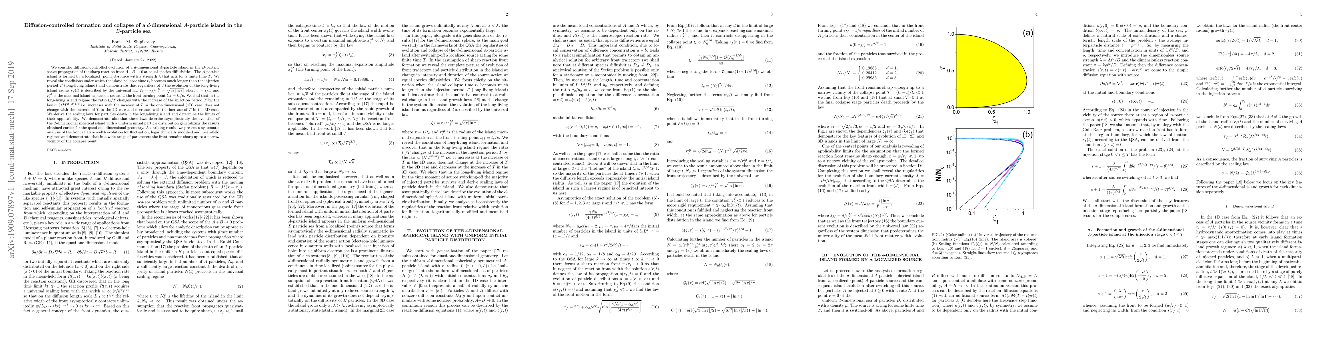 We consider diffusion-controlled evolution of a $d$-dimensional $A$-particle island in the $B$-particle sea at propagation of the sharp reaction front $A+B\to 0$ at equal species diffusivities. The $A$-particle island is formed by a localized (point)$A$-source with a strength $\lambda$ that acts for a finite time $T$. We reveal the conditions under which the island collapse time $t_{c}$ becomes much longer than the injection period $T$ (long-living island) and demonstrate that regardless of $d$ the evolution of the long-living island radius $r_{f}(t)$ is described by the universal law $\zeta_{f}=r_{f}/r_{f}^{M}=\sqrt{e\tau|\ln\tau|}$ where $\tau=t/t_{c}$ and $r_{f}^{M}$ is the maximal island expansion radius at the front turning point $t_{M}=t_{c}/e$. We find that in the long-living island regime the ratio $t_{c}/T$ changes with the increase of the injection period $T$ by the law $\propto (\lambda^{2}T^{2-d})^{1/d}$ i.e. increases with the increase of $T$ in the one-dimensional (1D) case, does not change with the increase of $T$ in the 2D case and decreases with the increase of $T$ in the 3D case. We derive the scaling laws for particles death in the long-living island and determine the limits of their applicability. We demonstrate also that these laws describe asymptotically the evolution of the $d$-dimensional spherical island with a uniform initial particle distribution generalizing the results obtained earlier for the quasi-one-dimensional geometry. As striking results we present a systematic analysis of the front relative width evolution for fluctuation, logarithmically modified and mean-field regimes and demonstrate that in a wide range of parameters the front remains sharp up to a narrow vicinity of the collapse point.