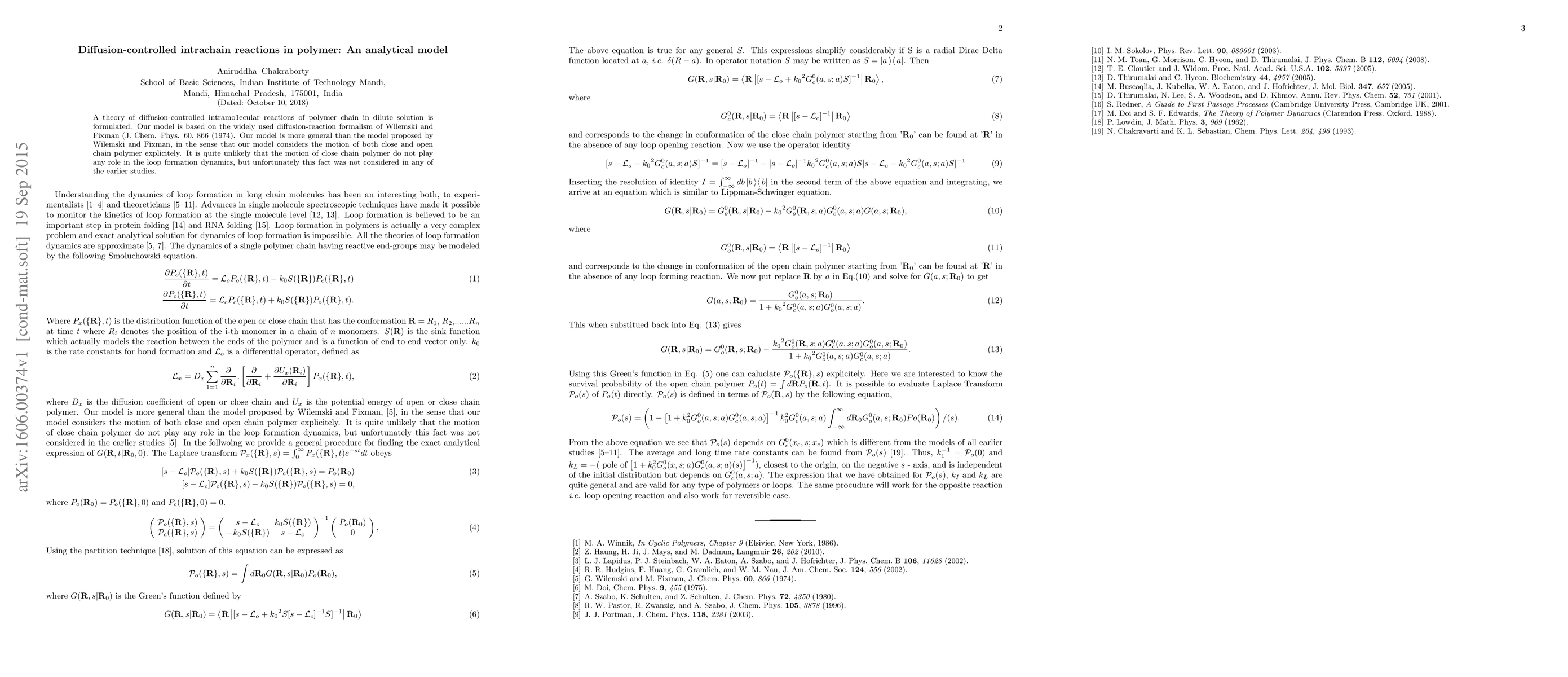 This paper presents a generalized analytical model for diffusion-controlled intramolecular reactions in polymer chains in dilute solution, extending the diffusion-reaction formalism of Wilemski and Fixman by explicitly considering both close and open chain polymer motions, which were previously overlooked in loop formation dynamics.