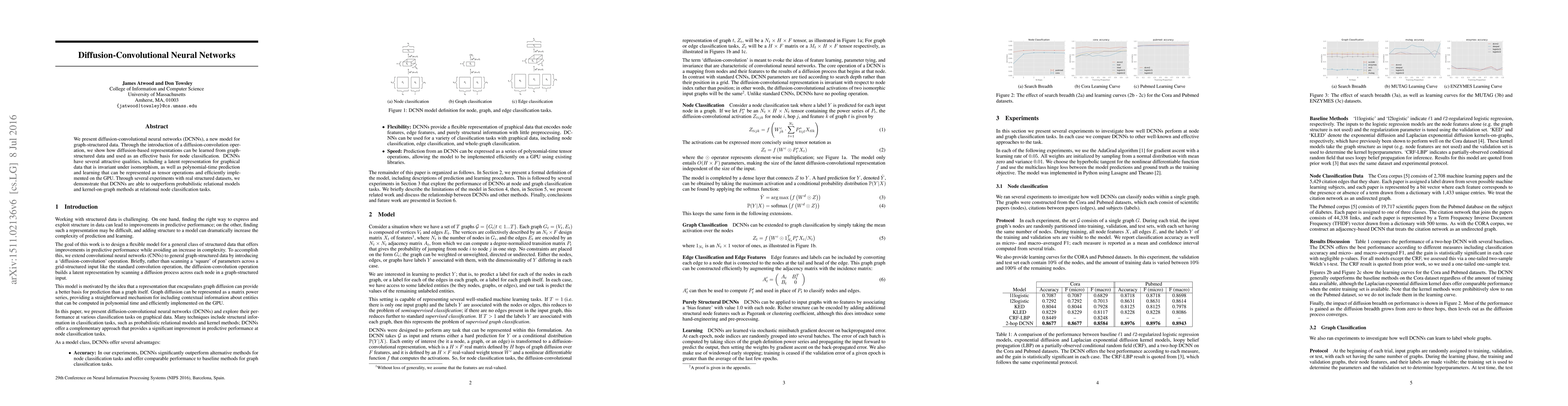 Diffusion-convolutional neural networks (DCNNs) introduce a diffusion-convolution operation to learn effective representations from graph-structured data, achieving superior performance in node classification compared to probabilistic relational models and kernel-on-graph methods. DCNNs offer invariant latent representations and efficient GPU-based implementation.