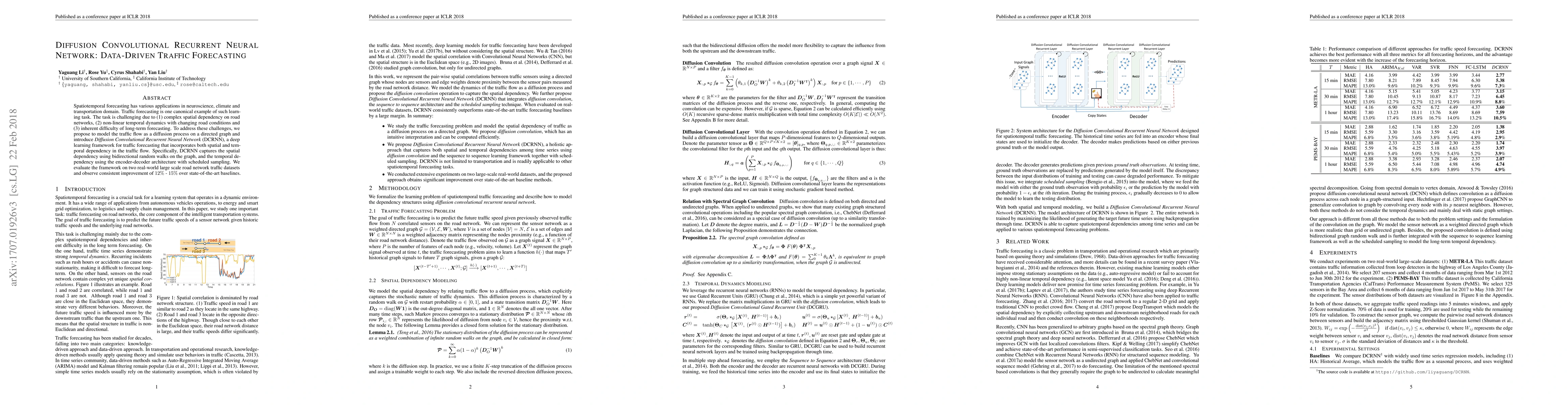 The paper proposes a Diffusion Convolutional Recurrent Neural Network (DCRNN) to improve traffic forecasting by modeling traffic flow as a diffusion process on a directed graph, capturing spatial and temporal dependencies, and achieving 12%-15% better performance than state-of-the-art baselines on large-scale road network datasets.
