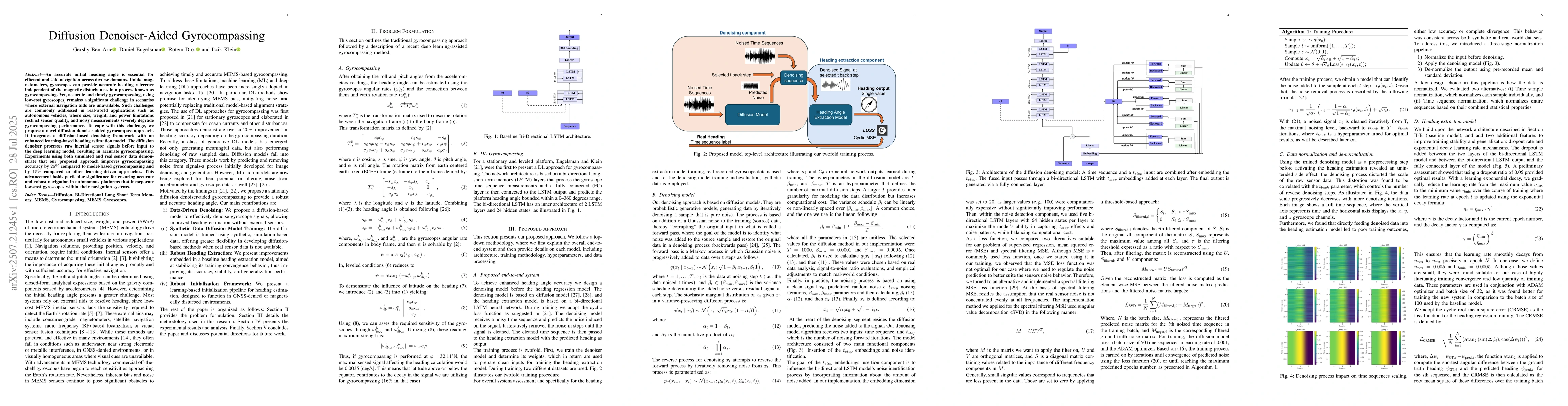 An accurate initial heading angle is essential for efficient and safe navigation across diverse domains. Unlike magnetometers, gyroscopes can provide accurate heading reference independent of the magnetic disturbances in a process known as gyrocompassing. Yet, accurate and timely gyrocompassing, using low-cost gyroscopes, remains a significant challenge in scenarios where external navigation aids are unavailable. Such challenges are commonly addressed in real-world applications such as autonomous vehicles, where size, weight, and power limitations restrict sensor quality, and noisy measurements severely degrade gyrocompassing performance. To cope with this challenge, we propose a novel diffusion denoiser-aided gyrocompass approach. It integrates a diffusion-based denoising framework with an enhanced learning-based heading estimation model. The diffusion denoiser processes raw inertial sensor signals before input to the deep learning model, resulting in accurate gyrocompassing. Experiments using both simulated and real sensor data demonstrate that our proposed approach improves gyrocompassing accuracy by 26% compared to model-based gyrocompassing and by 15% compared to other learning-driven approaches. This advancement holds particular significance for ensuring accurate and robust navigation in autonomous platforms that incorporate low-cost gyroscopes within their navigation systems.
