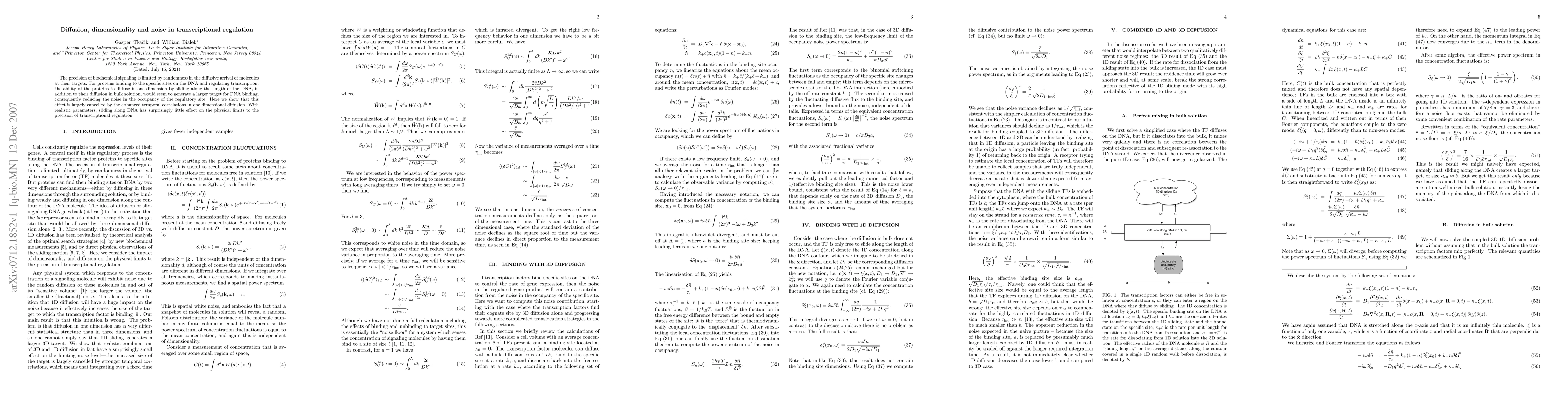 The precision of biochemical signaling is limited by randomness in the diffusive arrival of molecules at their targets. For proteins binding to the specific sites on the DNA and regulating transcription, the ability of the proteins to diffuse in one dimension by sliding along the length of the DNA, in addition to their diffusion in bulk solution, would seem to generate a larger target for DNA binding, consequently reducing the noise in the occupancy of the regulatory site. Here we show that this effect is largely cancelled by the enhanced temporal correlations in one dimensional diffusion. With realistic parameters, sliding along DNA has surprisingly little effect on the physical limits to the precision of transcriptional regulation.