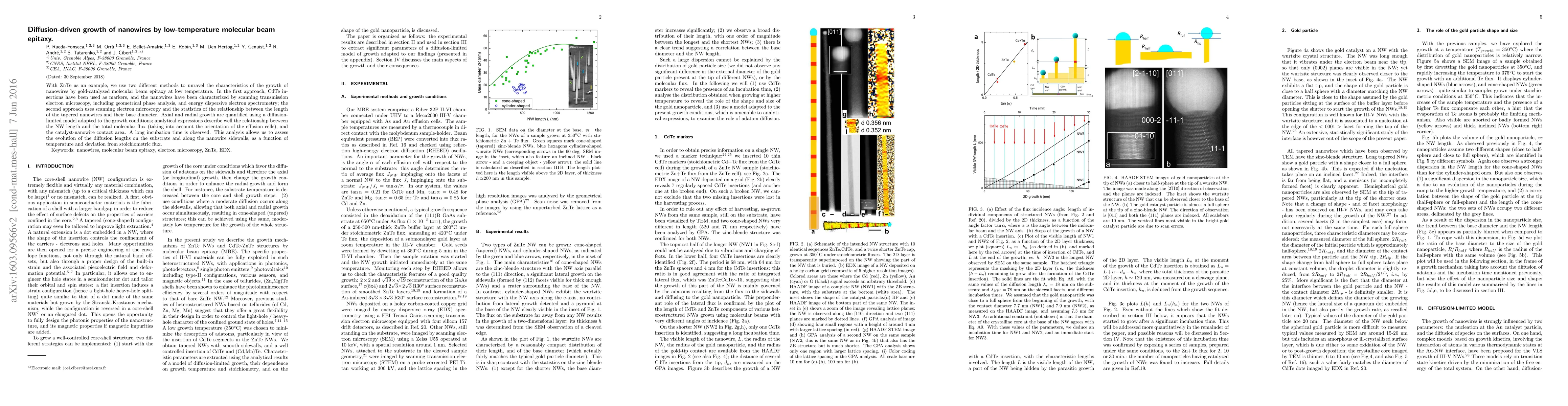 With ZnTe as an example, we use two different methods to unravel the characteristics of the growth of nanowires by gold-catalyzed molecular beam epitaxy at low temperature. In the first approach, CdTe insertions have been used as markers, and the nanowires have been characterized by scanning transmission electron microscopy, including geometrical phase analysis, and energy dispersive electron spectrometry; the second approach uses scanning electron microscopy and the statistics of the relationship between the length of the tapered nanowires and their base diameter. Axial and radial growth are quantified using a diffusion-limited model adapted to the growth conditions; analytical expressions describe well the relationship between the NW length and the total molecular flux (taking into account the orientation of the effusion cells), and the catalyst-nanowire contact area. A long incubation time is observed. This analysis allows us to assess the evolution of the diffusion lengths on the substrate and along the nanowire sidewalls, as a function of temperature and deviation from stoichiometric flux.
