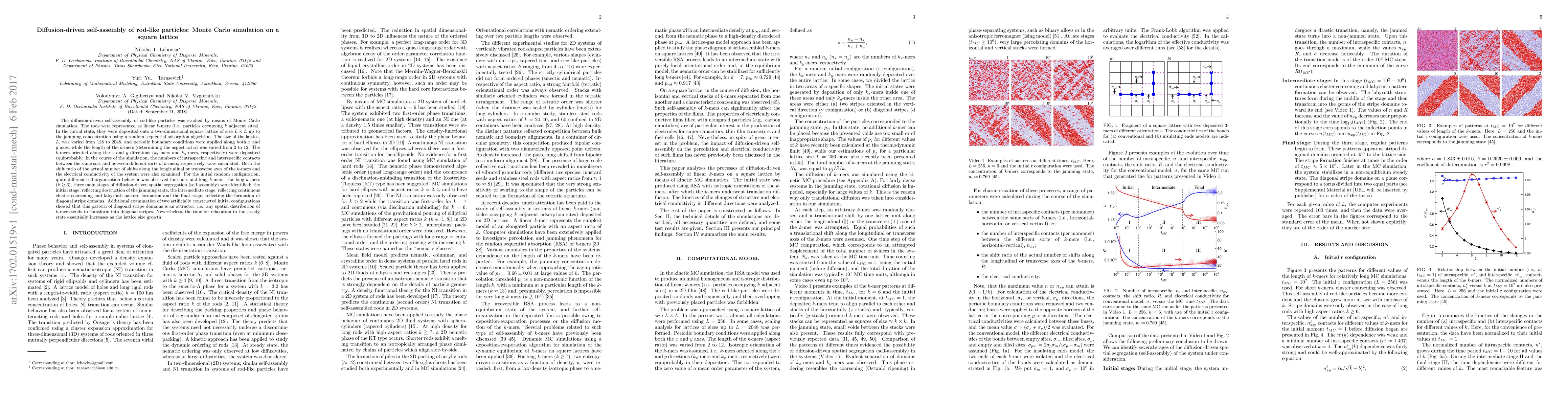 This paper investigates the diffusion-driven self-assembly of rod-like particles using Monte Carlo simulations on square lattices, identifying three stages of self-organization for long rods, including the formation of diagonal stripe domains. The study reveals that these domains are an attractor, though the relaxation time to this state increases with larger lattice sizes.