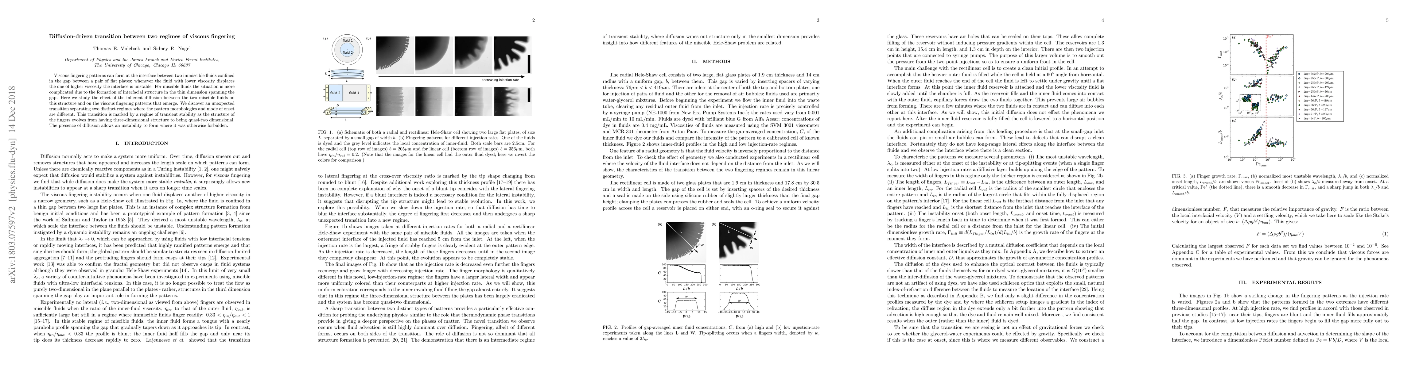 This study investigates the effect of diffusion between miscible fluids on viscous fingering patterns, revealing a transition between two distinct regimes characterized by different pattern morphologies and onset modes, with transient stability marking the shift from three-dimensional to quasi-two-dimensional finger structures.