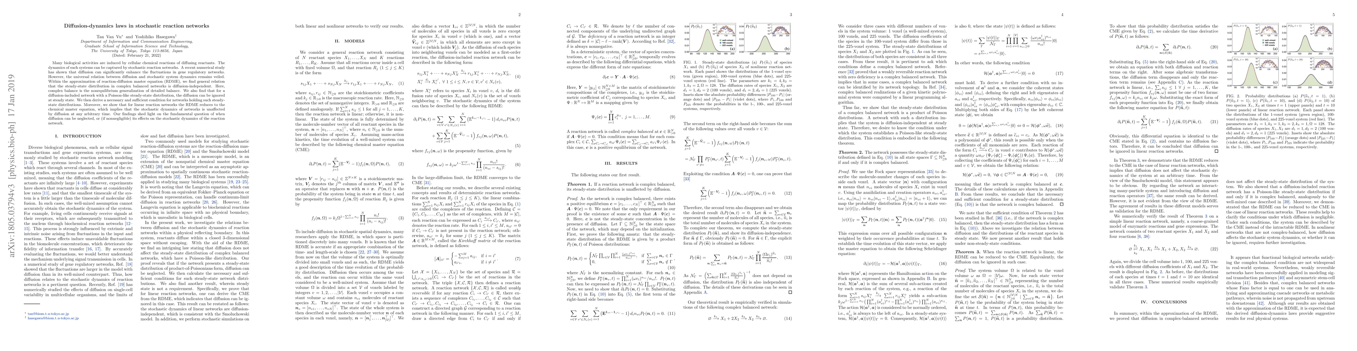Many biological activities are induced by cellular chemical reactions of diffusing reactants. The dynamics of such systems can be captured by stochastic reaction networks. A recent numerical study has shown that diffusion can significantly enhance the fluctuations in gene regulatory networks. However, the universal relation between diffusion and stochastic system dynamics remains veiled. Within the approximation of reaction-diffusion master equation (RDME), we find general relation that the steady-state distribution in complex balanced networks is diffusion-independent. Here, complex balance is the nonequilibrium generalization of detailed balance. We also find that for a diffusion-included network with a Poisson-like steady-state distribution, the diffusion can be ignored at steady state. We then derive a necessary and sufficient condition for networks holding such steady-state distributions. Moreover, we show that for linear reaction networks the RDME reduces to the chemical master equation, which implies that the stochastic dynamics of networks is unaffected by diffusion at any arbitrary time. Our findings shed light on the fundamental question of when diffusion can be neglected, or (if nonnegligible) its effects on the stochastic dynamics of the reaction network.
