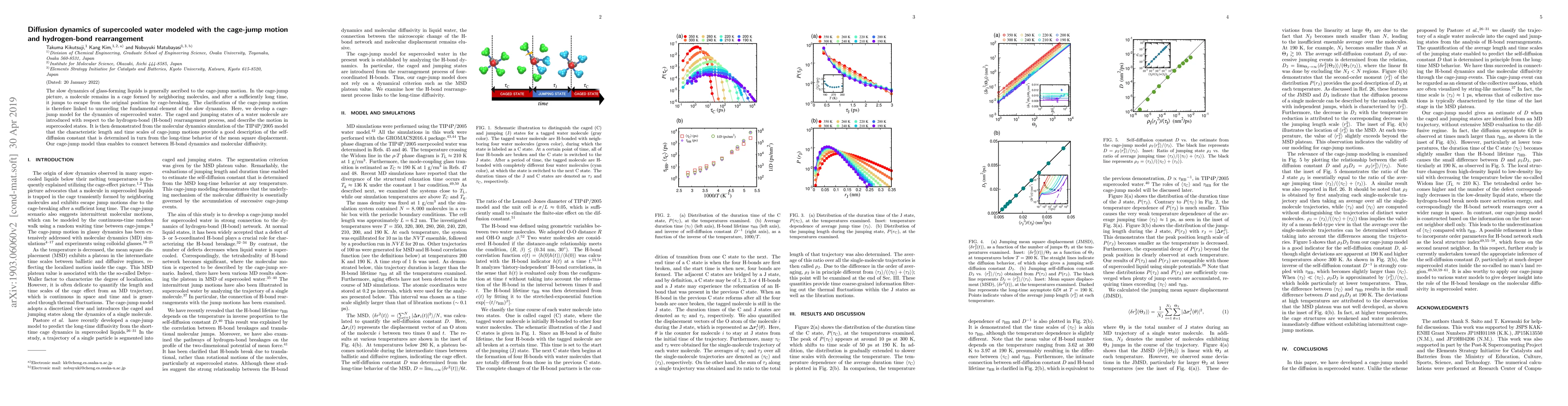 This paper develops a cage-jump model to describe the diffusion dynamics of supercooled water, linking hydrogen-bond rearrangement to molecular motion. Molecular dynamics simulations show that the model accurately captures the self-diffusion constant, thus connecting hydrogen-bond dynamics to molecular diffusivity.