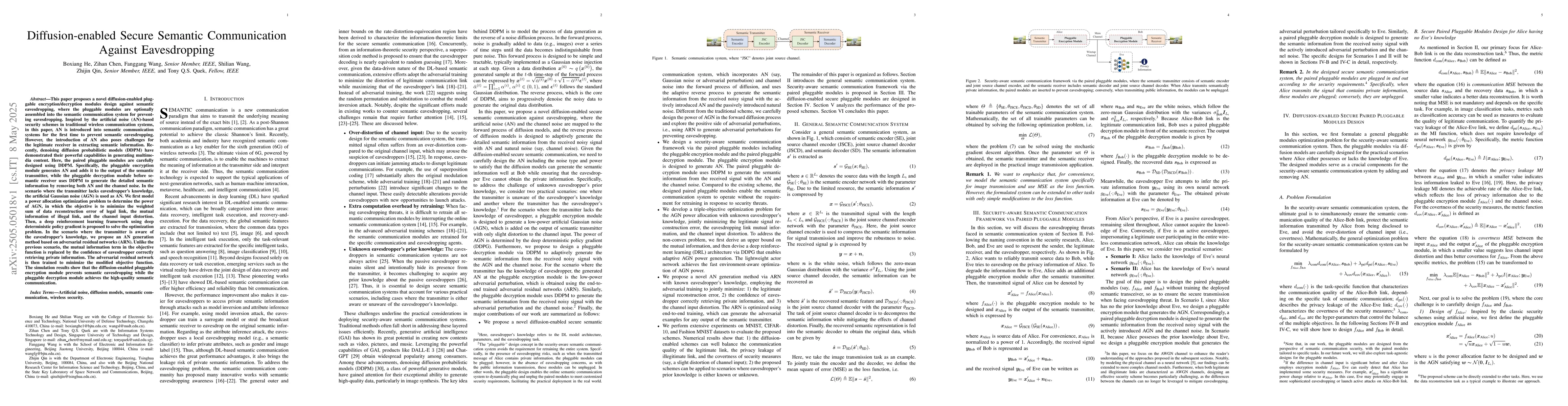 In this paper, AN is introduced into semantic communication systems for the first time to prevent semantic eavesdropping. However, the introduction of AN also poses challenges for the legitimate receiver in extracting semantic information. Recently, denoising diffusion probabilistic models (DDPM) have demonstrated their powerful capabilities in generating multimedia content. Here, the paired pluggable modules are carefully designed using DDPM. Specifically, the pluggable encryption module generates AN and adds it to the output of the semantic transmitter, while the pluggable decryption module before semantic receiver uses DDPM to generate the detailed semantic information by removing both AN and the channel noise. In the scenario where the transmitter lacks eavesdropper's knowledge, the artificial Gaussian noise (AGN) is used as AN. We first model a power allocation optimization problem to determine the power of AGN, in which the objective is to minimize the weighted sum of data reconstruction error of legal link, the mutual information of illegal link, and the channel input distortion. Then, a deep reinforcement learning framework using deep deterministic policy gradient is proposed to solve the optimization problem. In the scenario where the transmitter is aware of the eavesdropper's knowledge, we propose an AN generation method based on adversarial residual networks (ARN). Unlike the previous scenario, the mutual information term in the objective function is replaced by the confidence of eavesdropper correctly retrieving private information. The adversarial residual network is then trained to minimize the modified objective function. The simulation results show that the diffusion-enabled pluggable encryption module prevents semantic eavesdropping while the pluggable decryption module achieves the high-quality semantic communication.