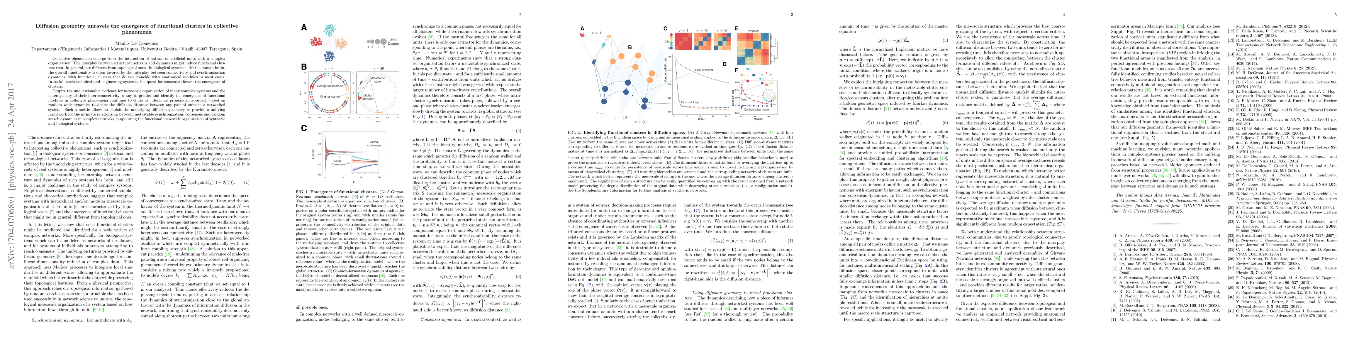 Collective phenomena emerge from the interaction of natural or artificial units with a complex organization. The interplay between structural patterns and dynamics might induce functional clusters that, in general, are different from topological ones. In biological systems, like the human brain, the overall functionality is often favored by the interplay between connectivity and synchronization dynamics, with functional clusters that do not coincide with anatomical modules in most cases. In social, socio-technical and engineering systems, the quest for consensus favors the emergence of clusters. Despite the unquestionable evidence for mesoscale organization of many complex systems and the heterogeneity of their inter-connectivity, a way to predict and identify the emergence of functional modules in collective phenomena continues to elude us. Here, we propose an approach based on random walk dynamics to define the diffusion distance between any pair of units in a networked system. Such a metric allows to exploit the underlying diffusion geometry to provide a unifying framework for the intimate relationship between metastable synchronization, consensus and random search dynamics in complex networks, pinpointing the functional mesoscale organization of synthetic and biological systems.
